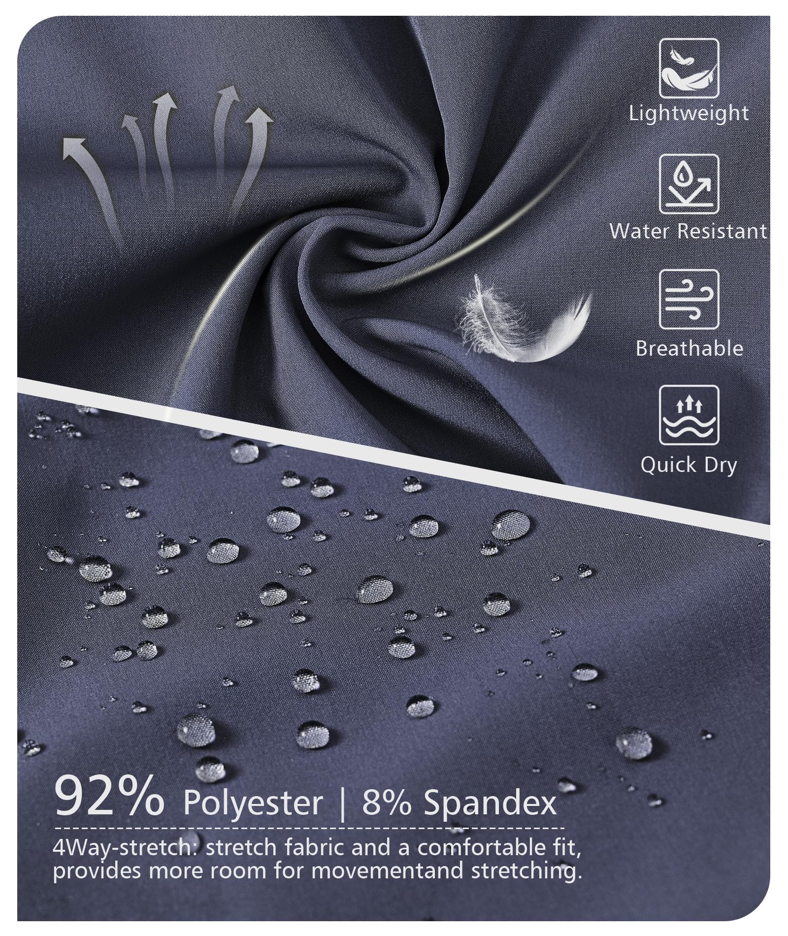 Stretch Fabric: Lightweight, breathable, quick dry, 4-way stretch fabric and comfortably tailored, durable enough to do any sport and casual wear.