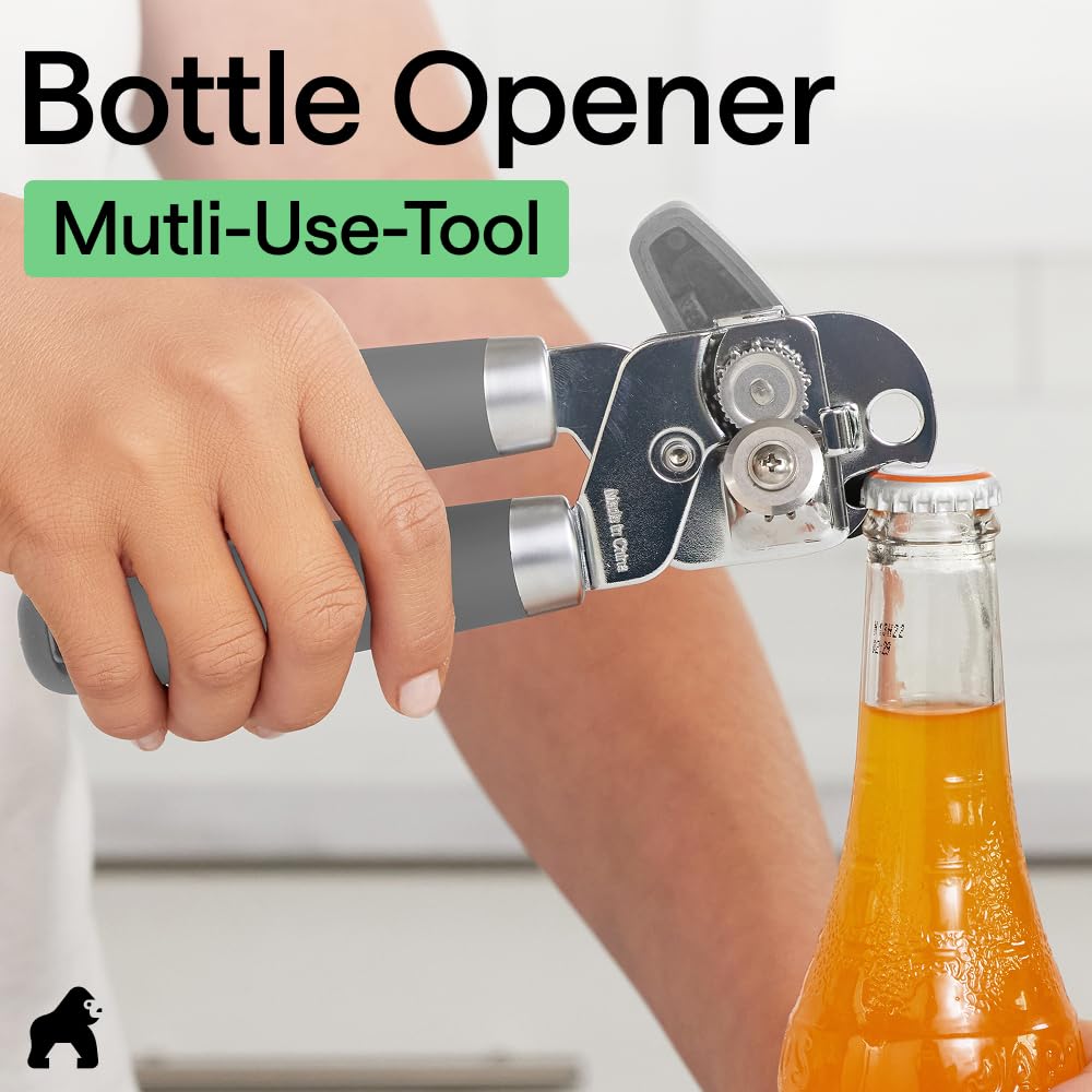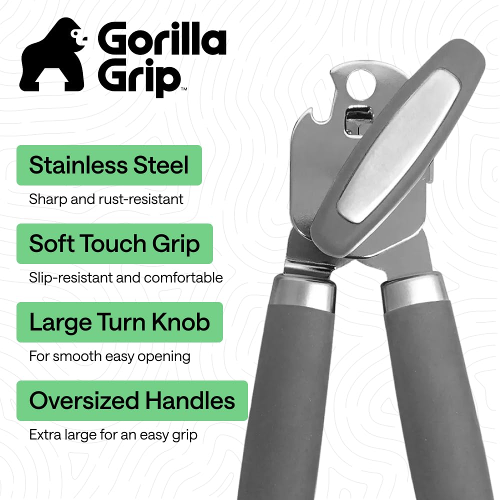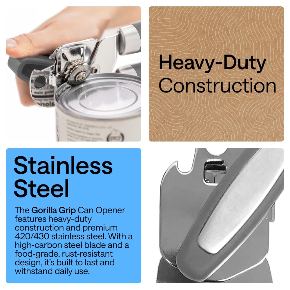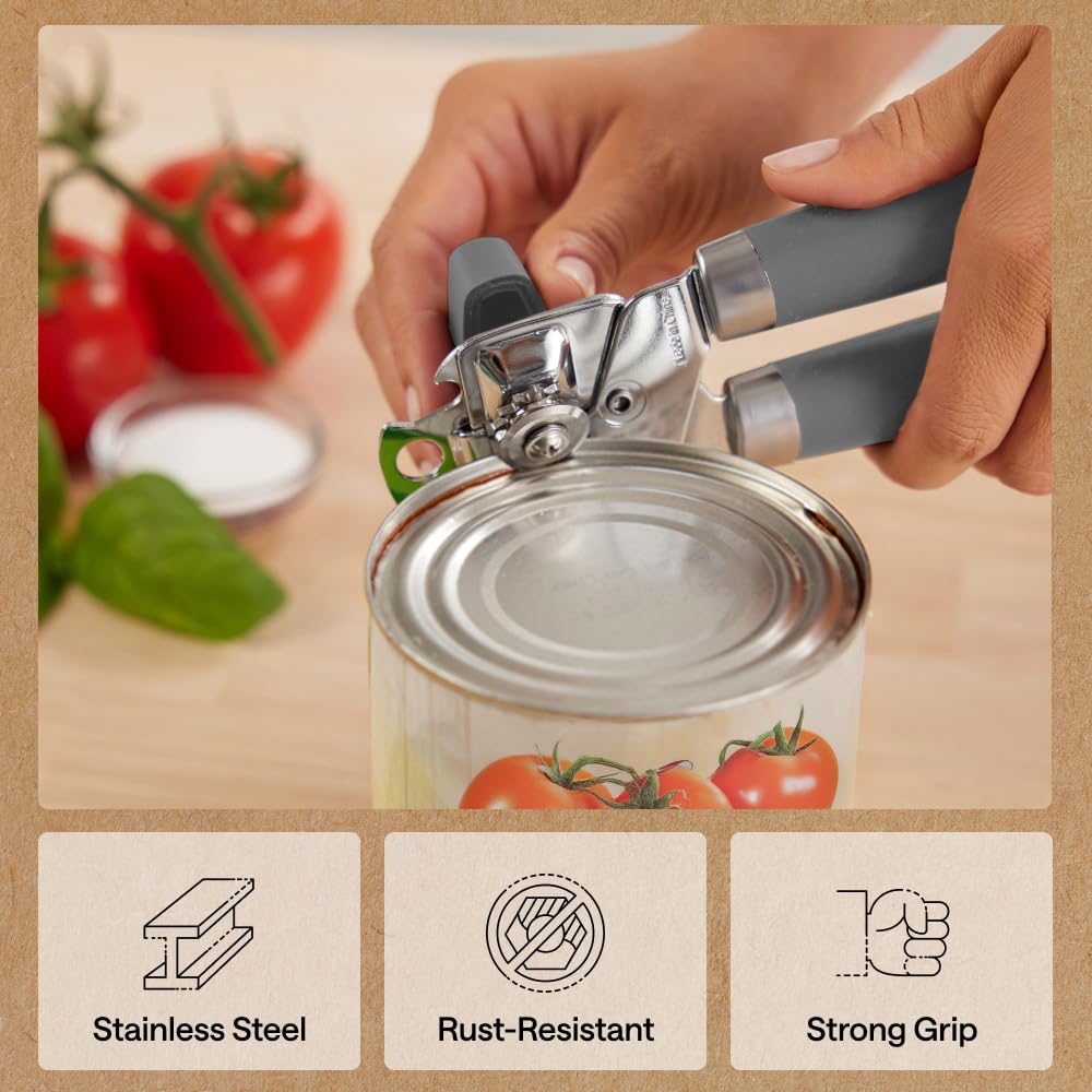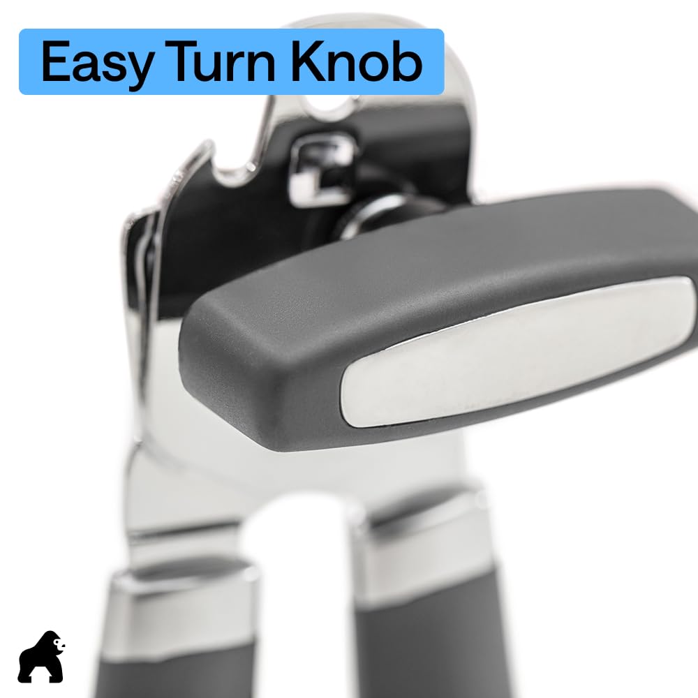 Heavy Duty Construction for Easier Opening: effortless can opening is here; the can opener features an extra large turn knob that allows you to easily open the can with little effort, so you work with the motion instead of against it; also includes stainless steel construction for a seamless cut and oversized handles that make for an easier grip