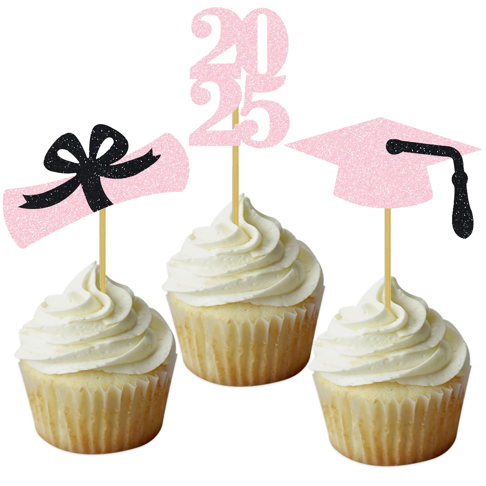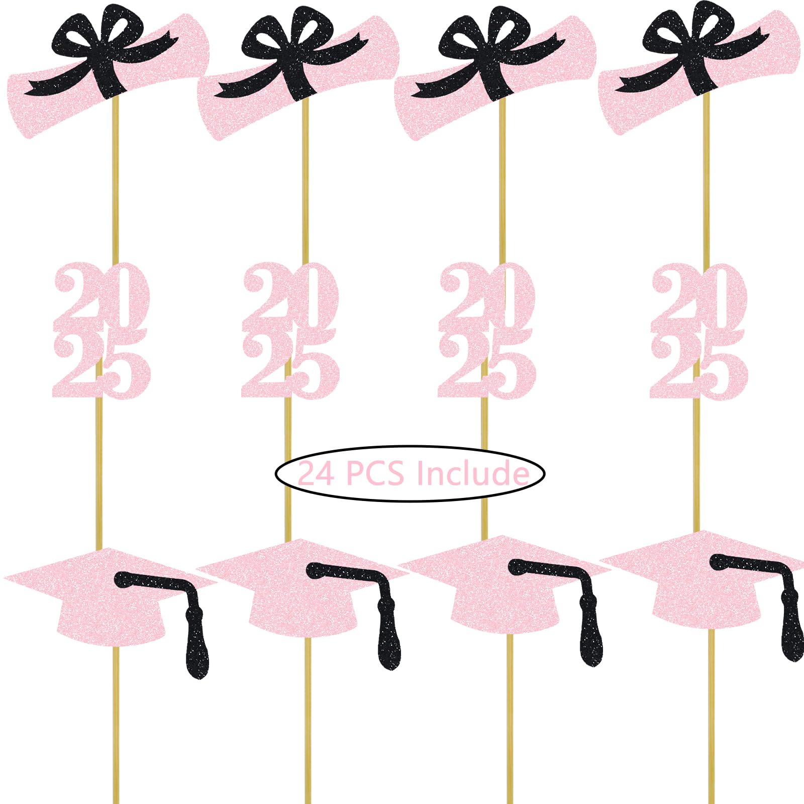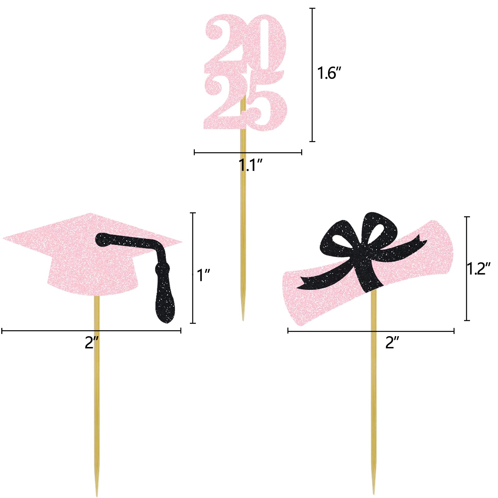 2025 graduation cap cupcake toppers: 8 pcs pink grad cap cupcake toppers with black tassel, 8 pcs 2025 pink number cupcake toppers, 8 pcs pink diploma black bow cupcake toppers