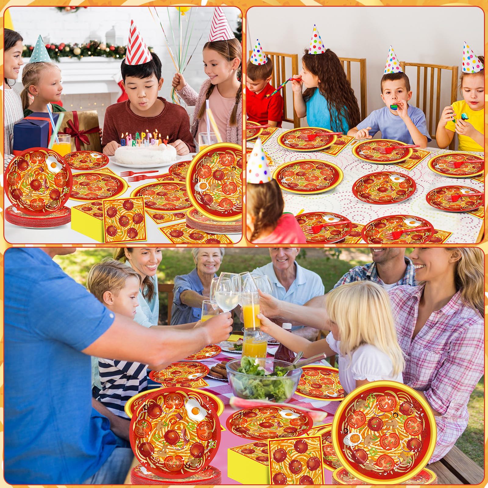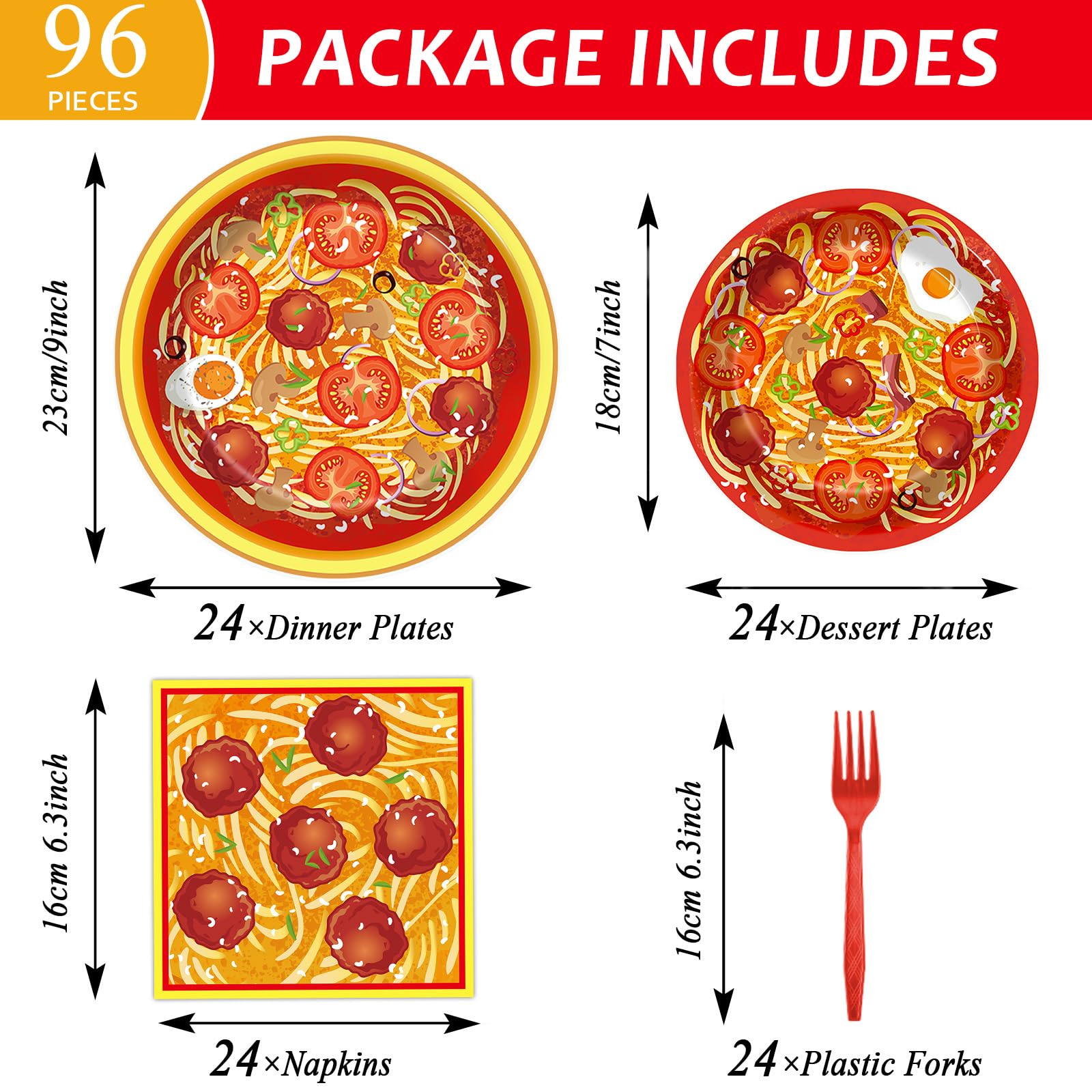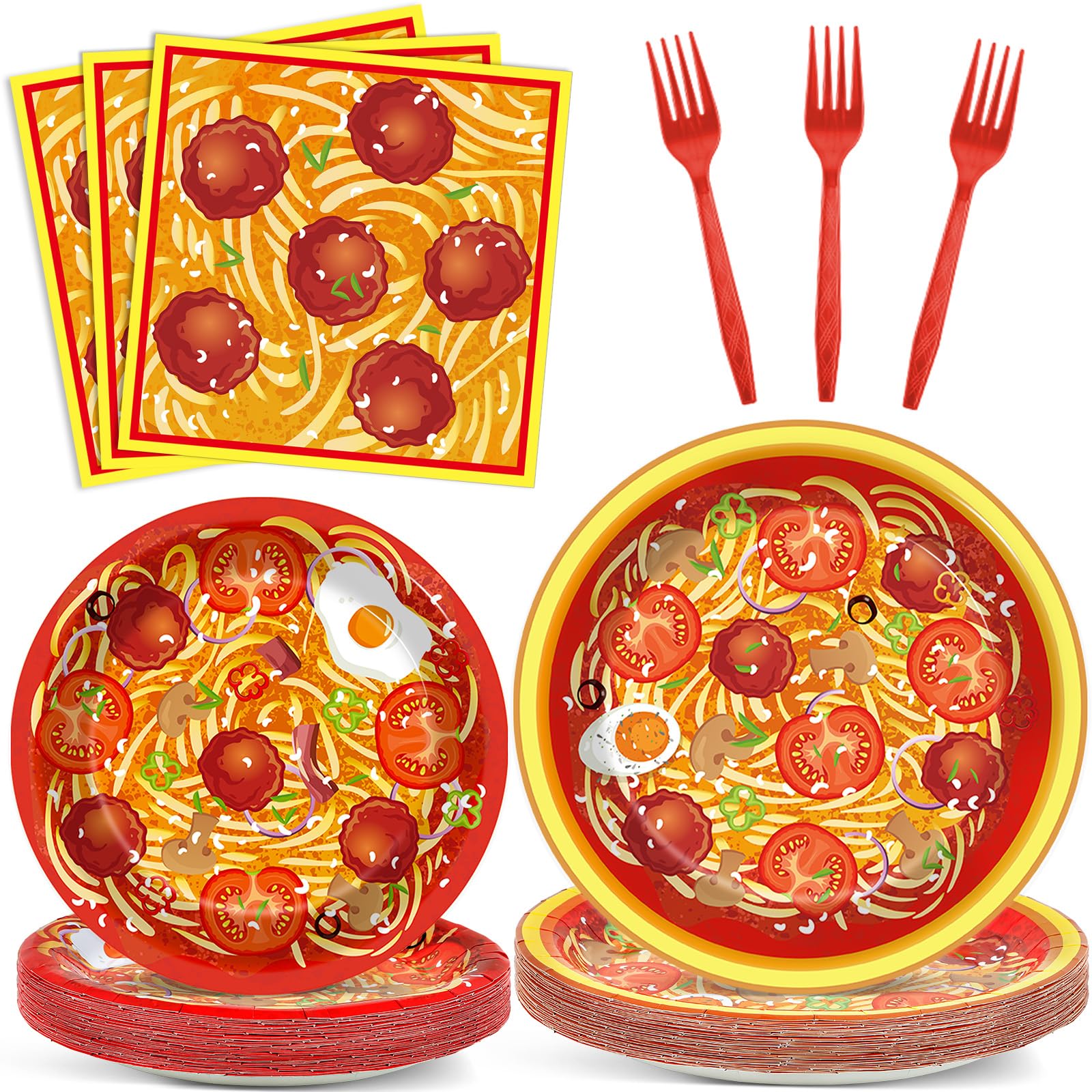 Package includes: You will get 24 sets of Spaghetti party tableware sets, including 24pcs 9inches plates, 24pcs 7inches plates, and 24pcs napkins(About 6.5 x 6.5 inches folded, About 13 x 13 inches unfolded), and 24pcs 6.3inch orange forks, totally 96pcs, each set serves for 24 guests. Sufficient quantities can satisfy your party needs, ensuring your guests a comfortable dining experience.