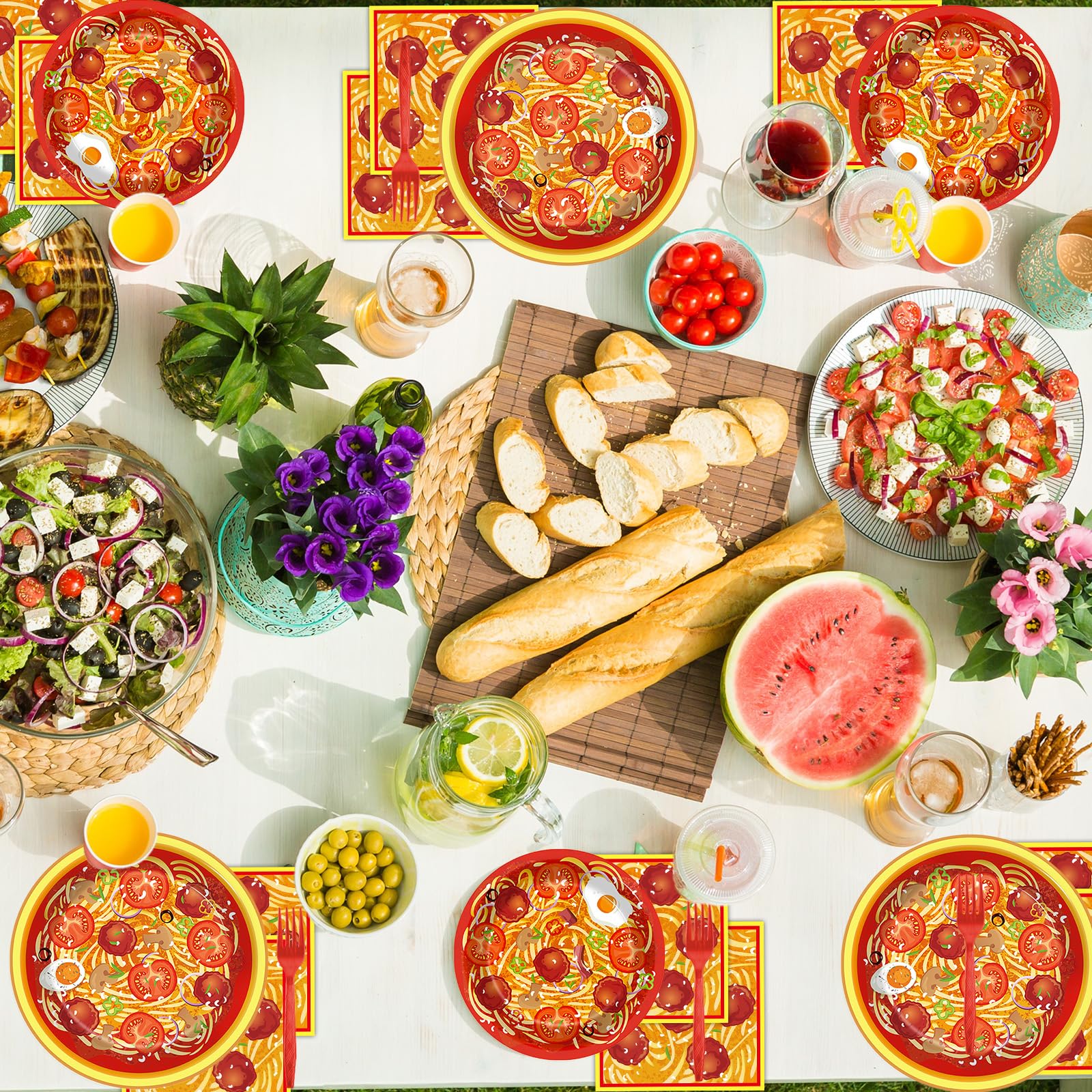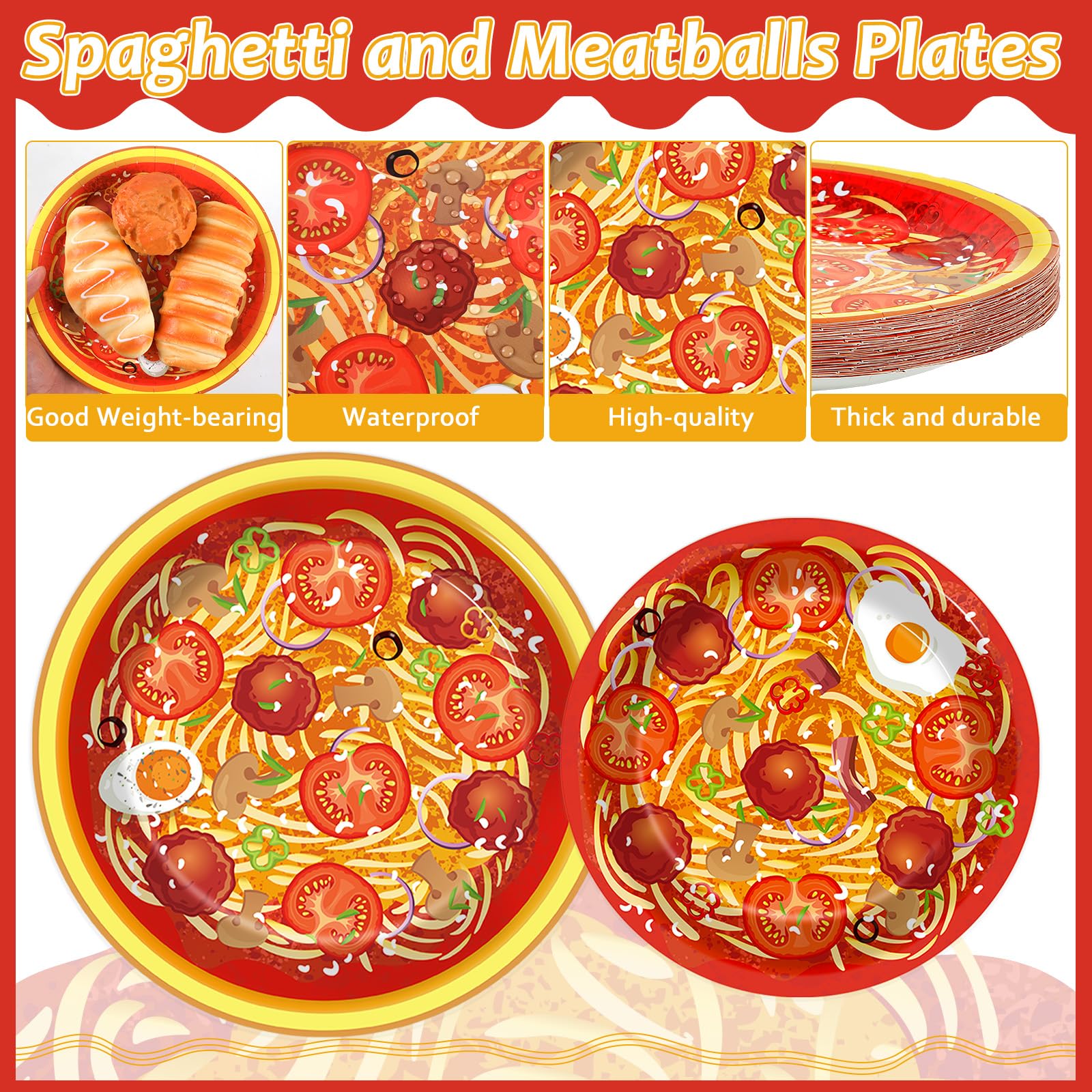 Eye-catching design: Featuring vibrant patterns of spaghetti, meatballs, tomatoes, eggs, and mushrooms, our plates and napkins will make your table look as delicious as the food served. The colorful designs add a fun, festive touch to any gathering, making this Spaghetti tableware set ideal for spaghetti lovers and food enthusiasts alike.