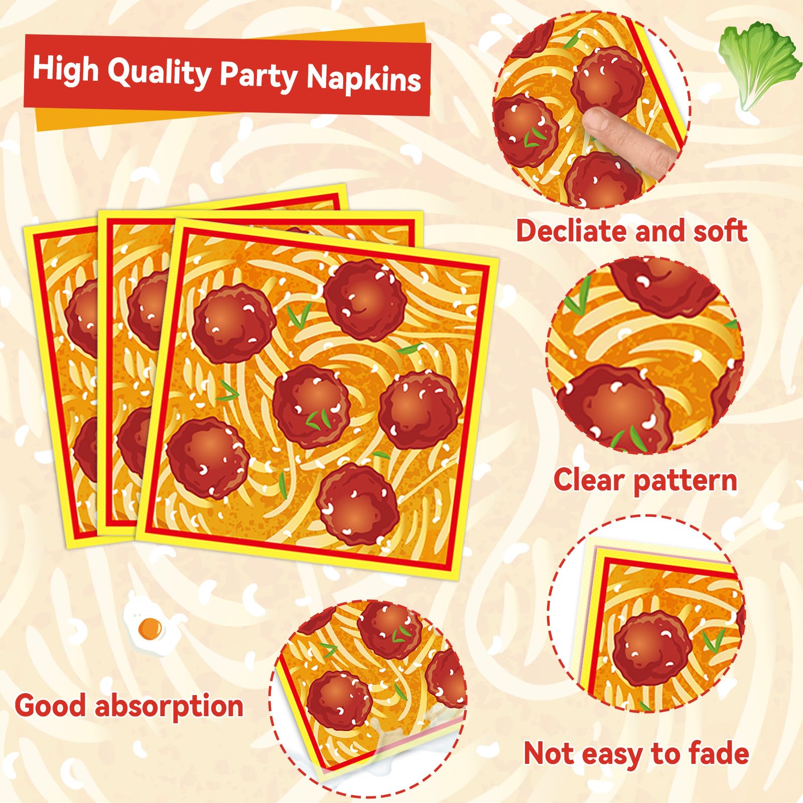 Premium material: Meatball birthday party dinner plates are crafted from high-quality, heat-resistant, and durable paper. The Spaghetti paper napkins are soft, resilient, and resistant to tearing, while the forks are made from durable, high-quality plastic. You can use them with complete confidence.