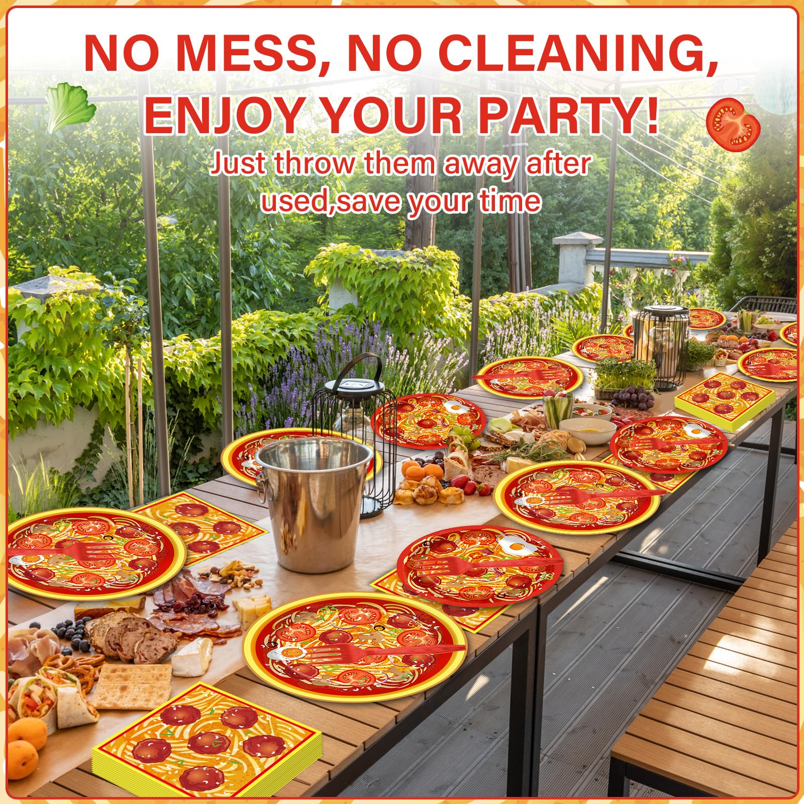 Save your time: These disposable Spaghetti party paper plates napkins decoration can be thrown away after you use them, which can save you from the hassle of dishes-washing. When the party's over, you can spend more time with your family or friends and less time cleaning up.
