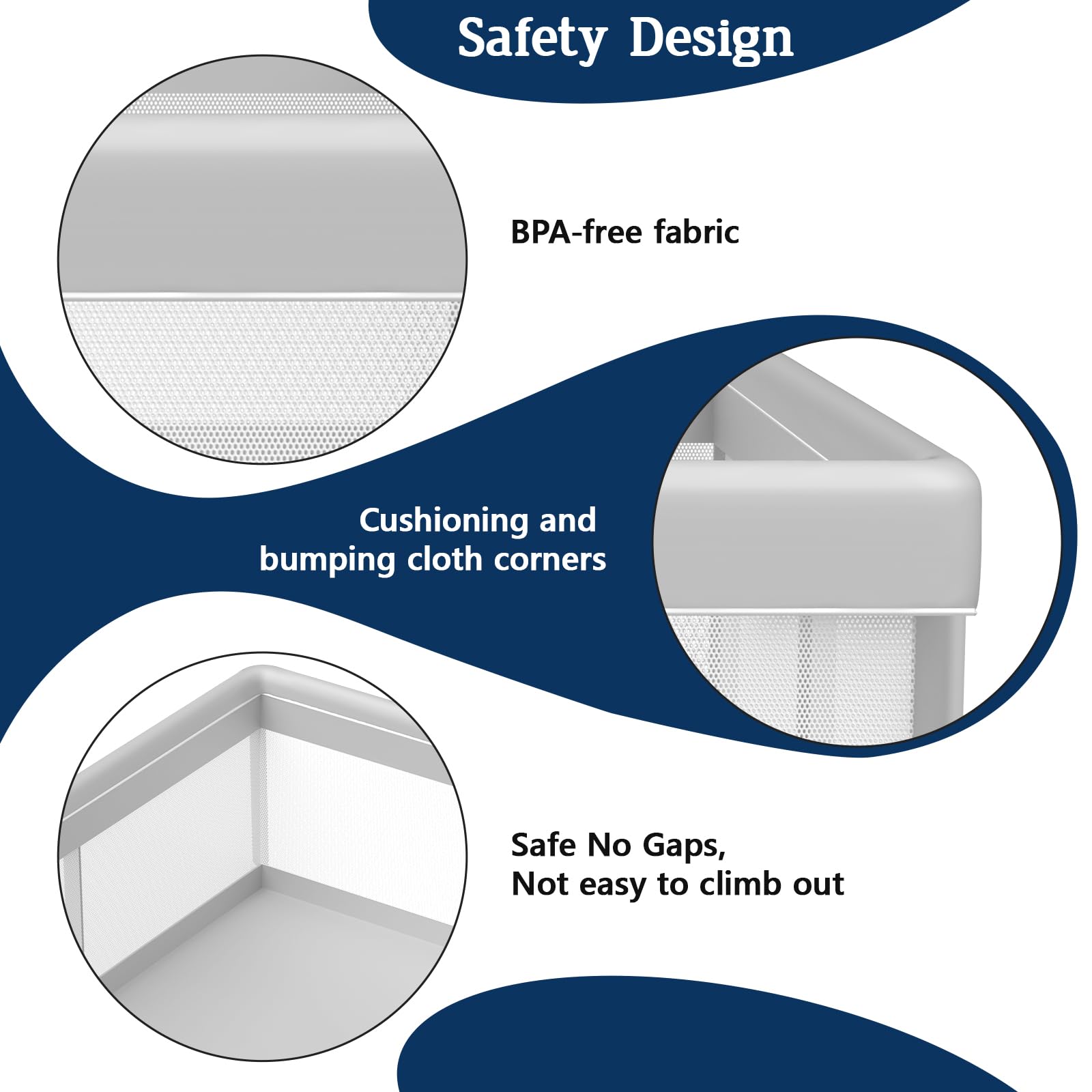 360 ° VISUAL DESIGN:Our Baby playpen is 360 ° visual design, even if you are busy doing other things, its sides allow you to keep an eye on baby at all times. At the same time, baby can also see mom through the mesh,fostering comfort and safety.