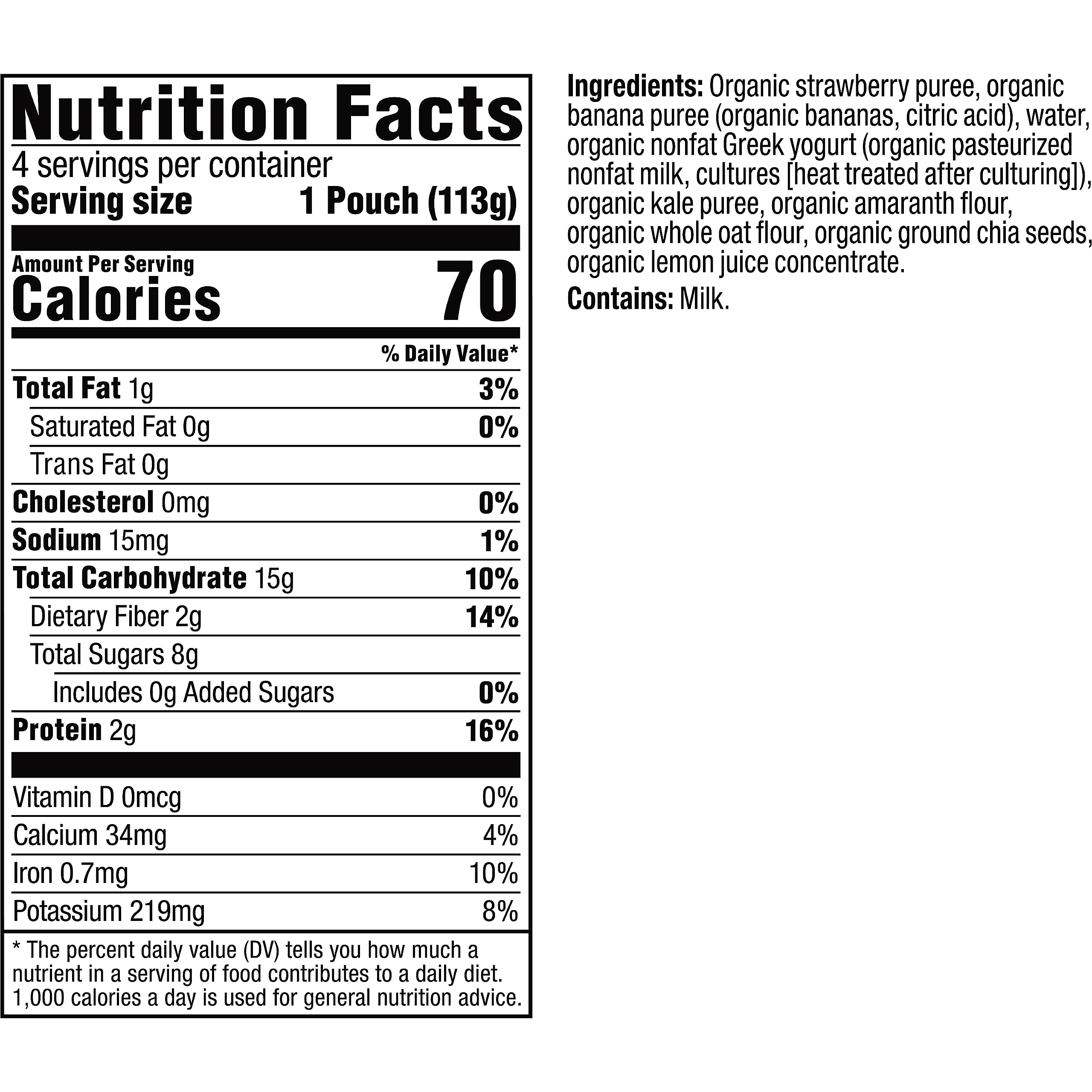 MADE WITH NATURAL FLAVORS: Contains organic strawberry, organic banana, organic Greek yogurt, organic kale, and organic amaranth and whole oat flours