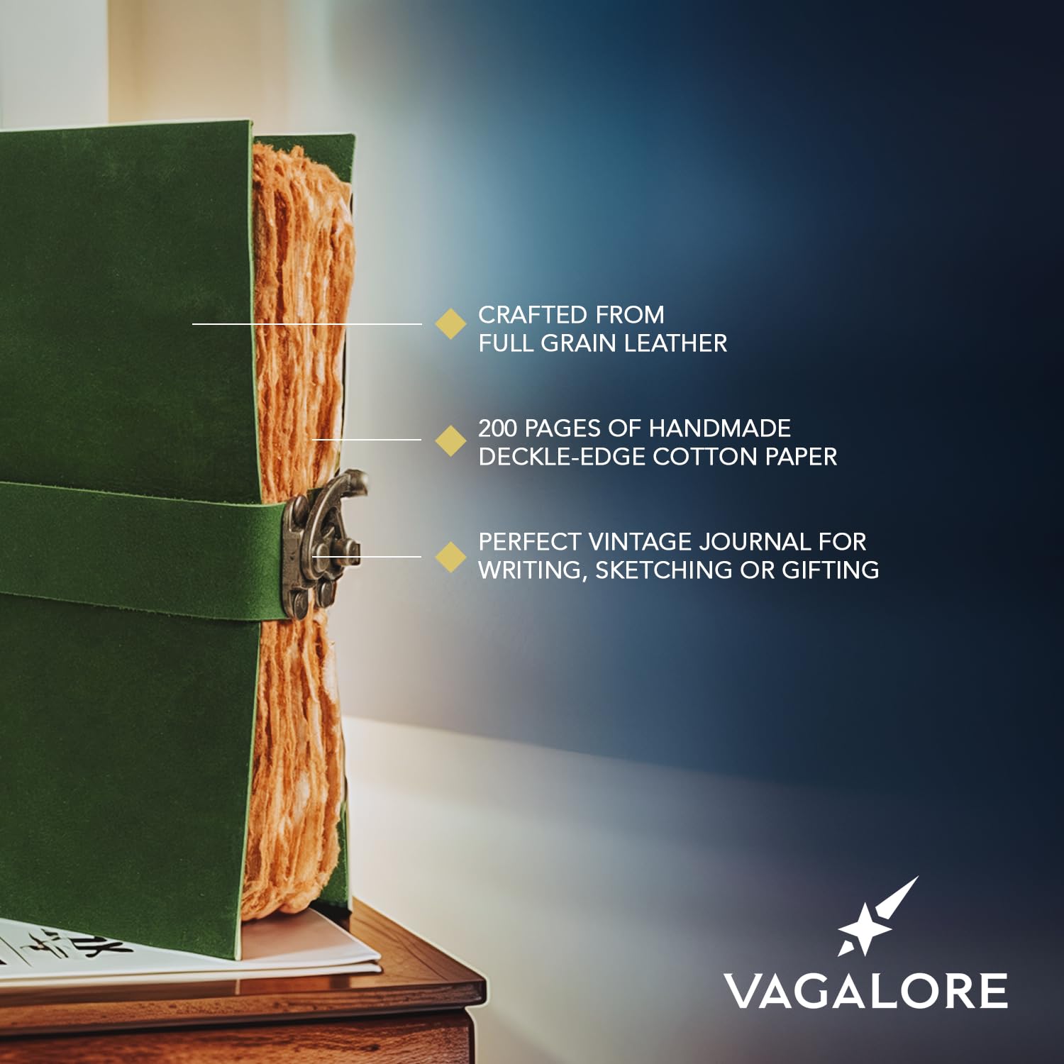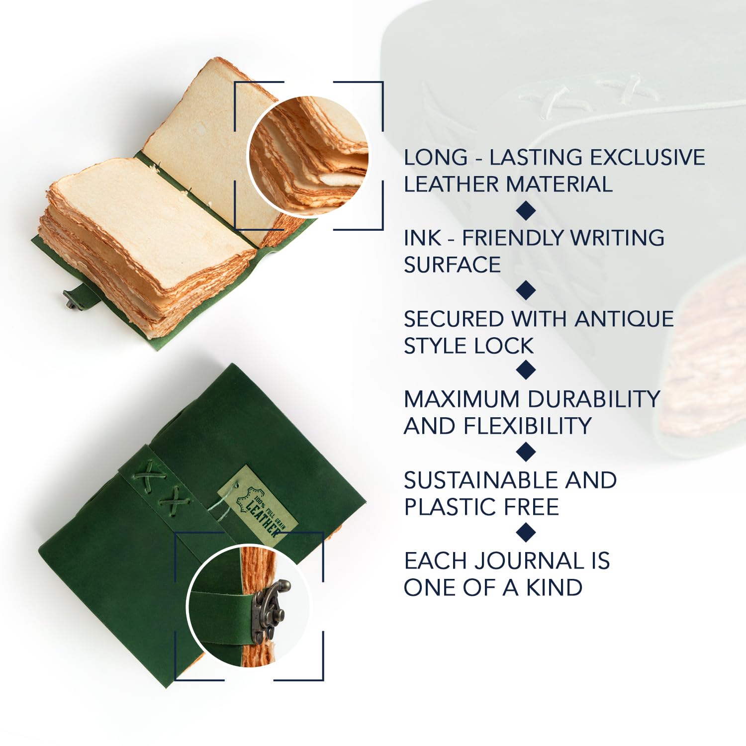 [๐๐๐ง๐๐ฆ๐๐๐ ๐๐๐๐ค๐ฅ๐๐ ๐๐๐ฉ๐๐ซ] Filled with 200 pages of eco-friendly, 125 GSM handmade unlined, deckle-edge golden paper, this vintage notebook is a joy to write or draw on. The soft, textured deckled edges add a vintage feel and work beautifully with fountain pens, ballpoints, graphite, or pencils. No ink bleed-through means your work stays crisp and legible.