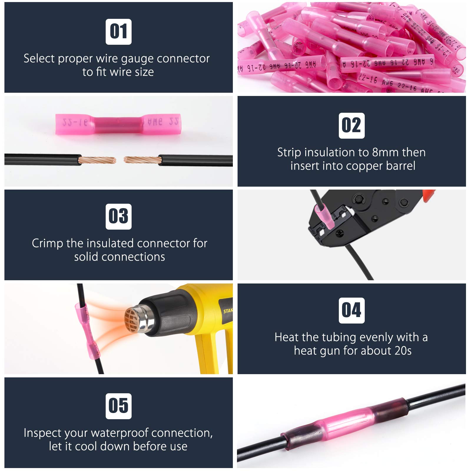 MADE TO LAST: Thanks to the thick tinned copper and seamless barrel desgin, it ensures strong andsecure crimping all the time with no wire coming off issues. What's more, the polyolefin heat shrink tubingprovides the high tensile strength and resistance to mechanical damage so there's no worry of rat chewingor similiar phisical damage issues When heated with a heat gun, the adhesive melting inside create awaterproof and insulated seal, preventing electric leakage and corrosion