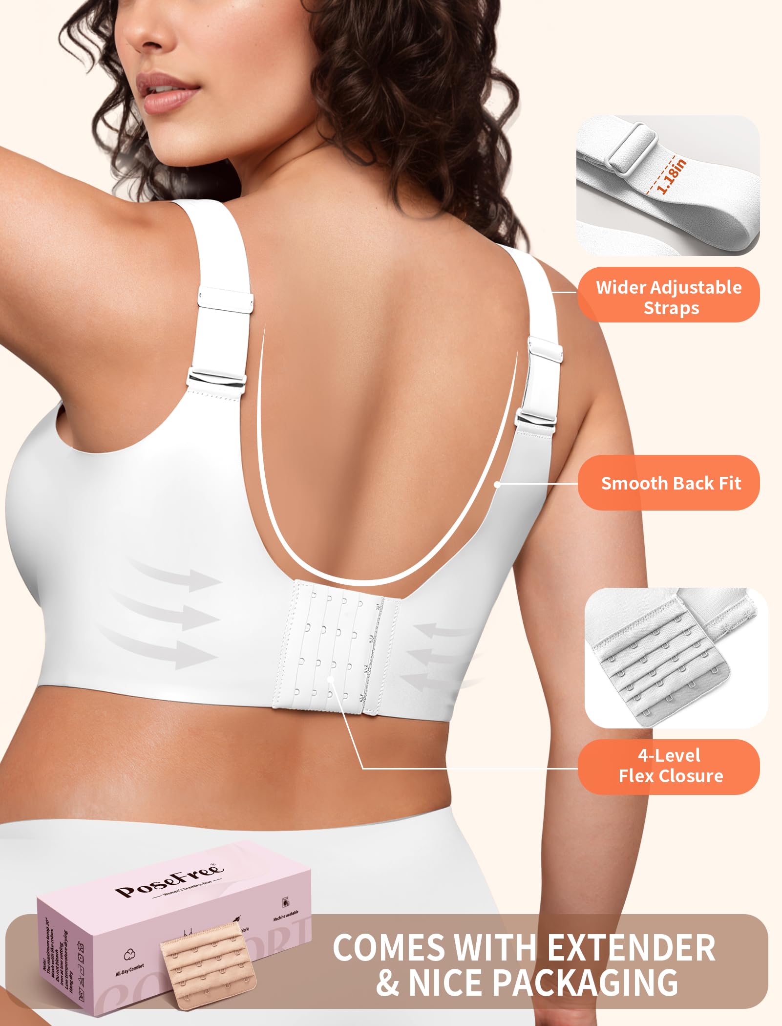 Back-Smoothing Design with Adjustable Fit:The bra features 5 rows of 4 buckles and a free extender for a customizable fit. A U-shaped back and widened side wings effectively smooth out back fat and underarm bulges, giving you a sleek silhouette.