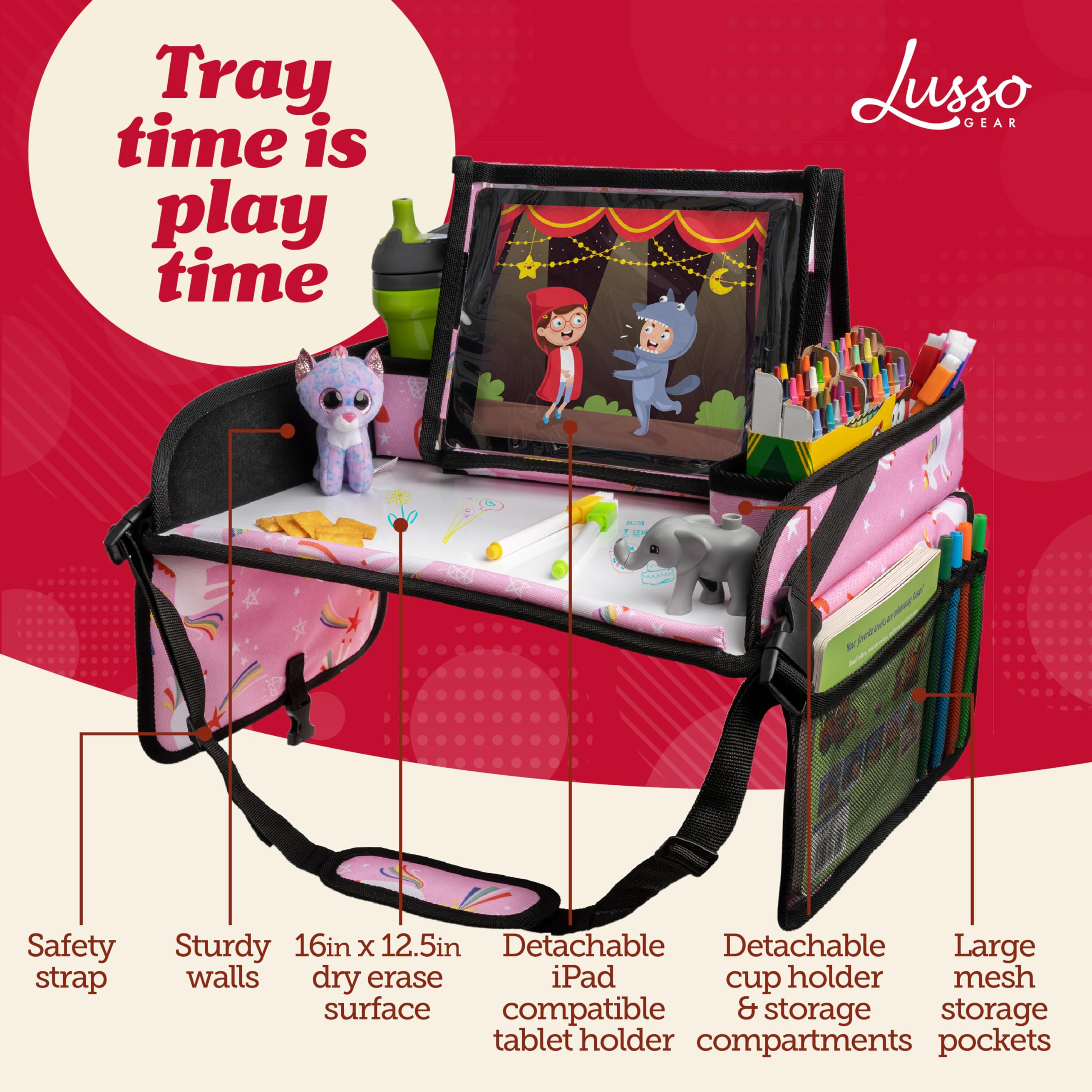 Toddler Travel Essential: The Lusso Gear Travel Tray is your go-to for keeping kids happy on road trips. This car seat accessory features a dry erase board and snack compartments, making it one of the ultimate toddler travel essentials