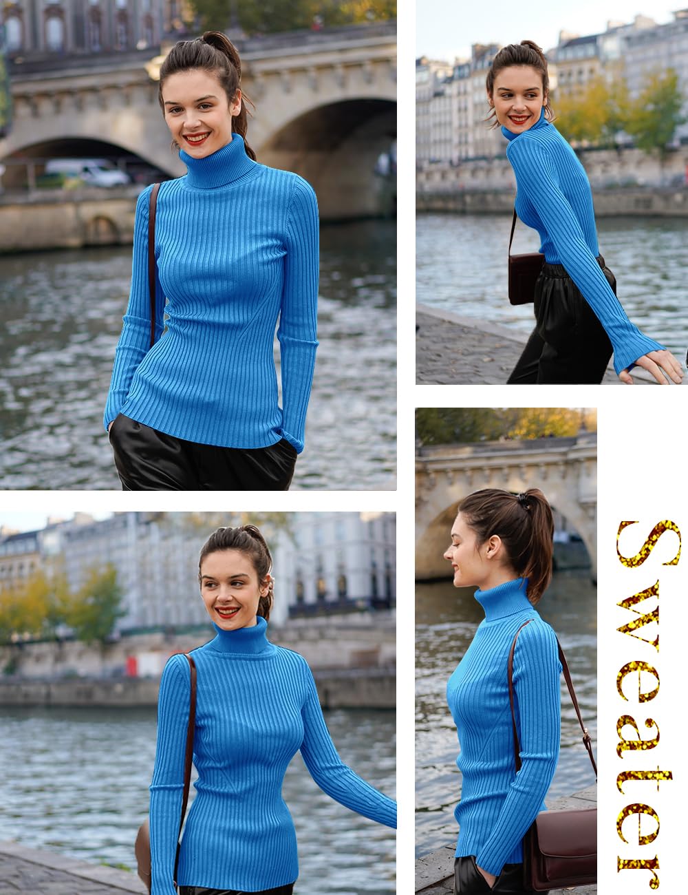 Turtle Neck Ribbed Sweater -- Knitted by Germany STROLL Machine to Ensure its High Quality Material: Highly Stretchable Viscose (Comfy Silky Smooth Feeling and Showing Off your Sexy Female Curve Silhouette)