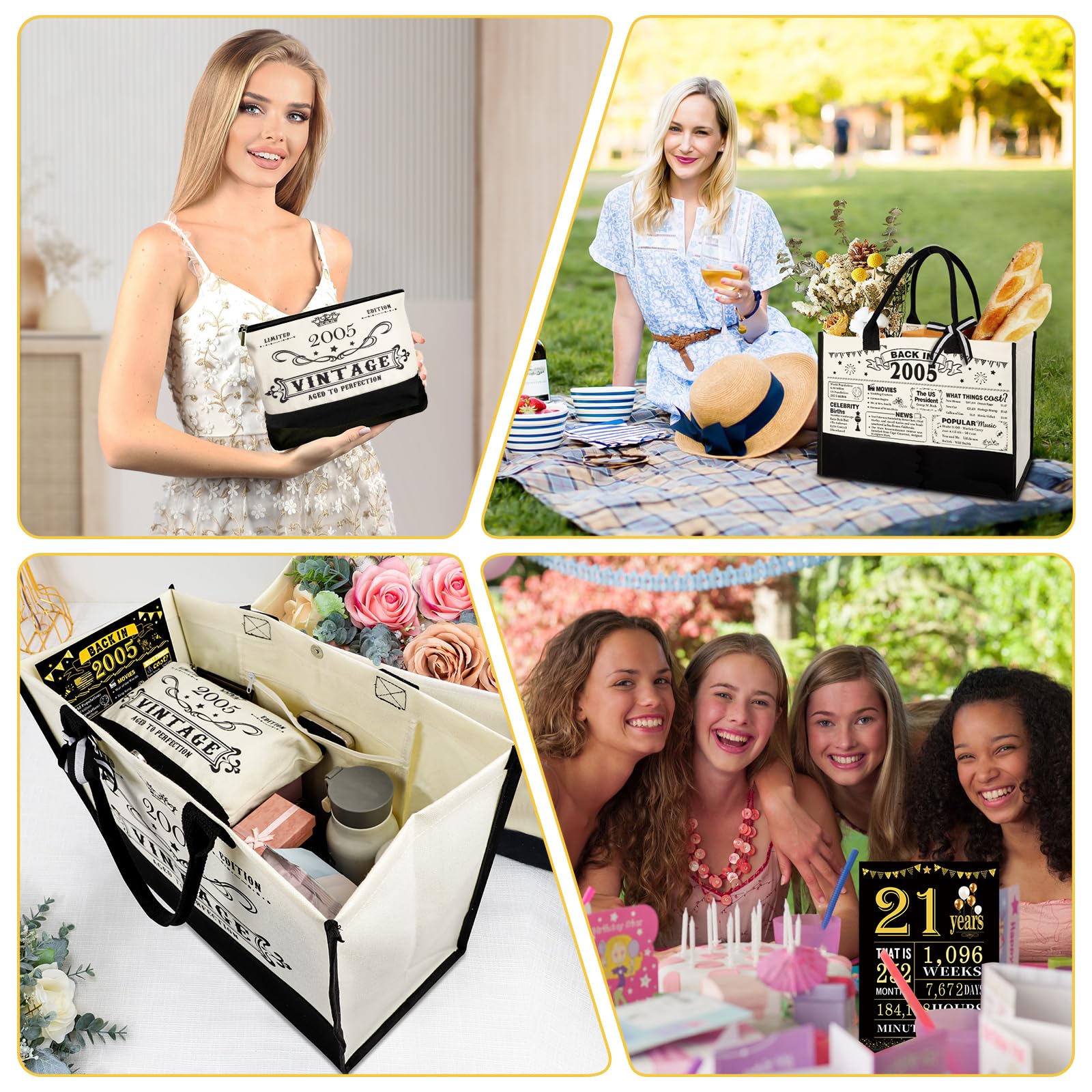 Great Gift for Her 21st Birthday: This gifts set for 21st birthday women contains: 1 X 2005 beach bag, 1 X cosmetic bag, 1 X back in 2005 poster, 1 X greeting card. Unique canvas tote bag gifts set will be a adorable gift for women's 21st birthday. This birthday 21 gifts themed idea makes the perfect choice for putting a smile on her face on their special day.