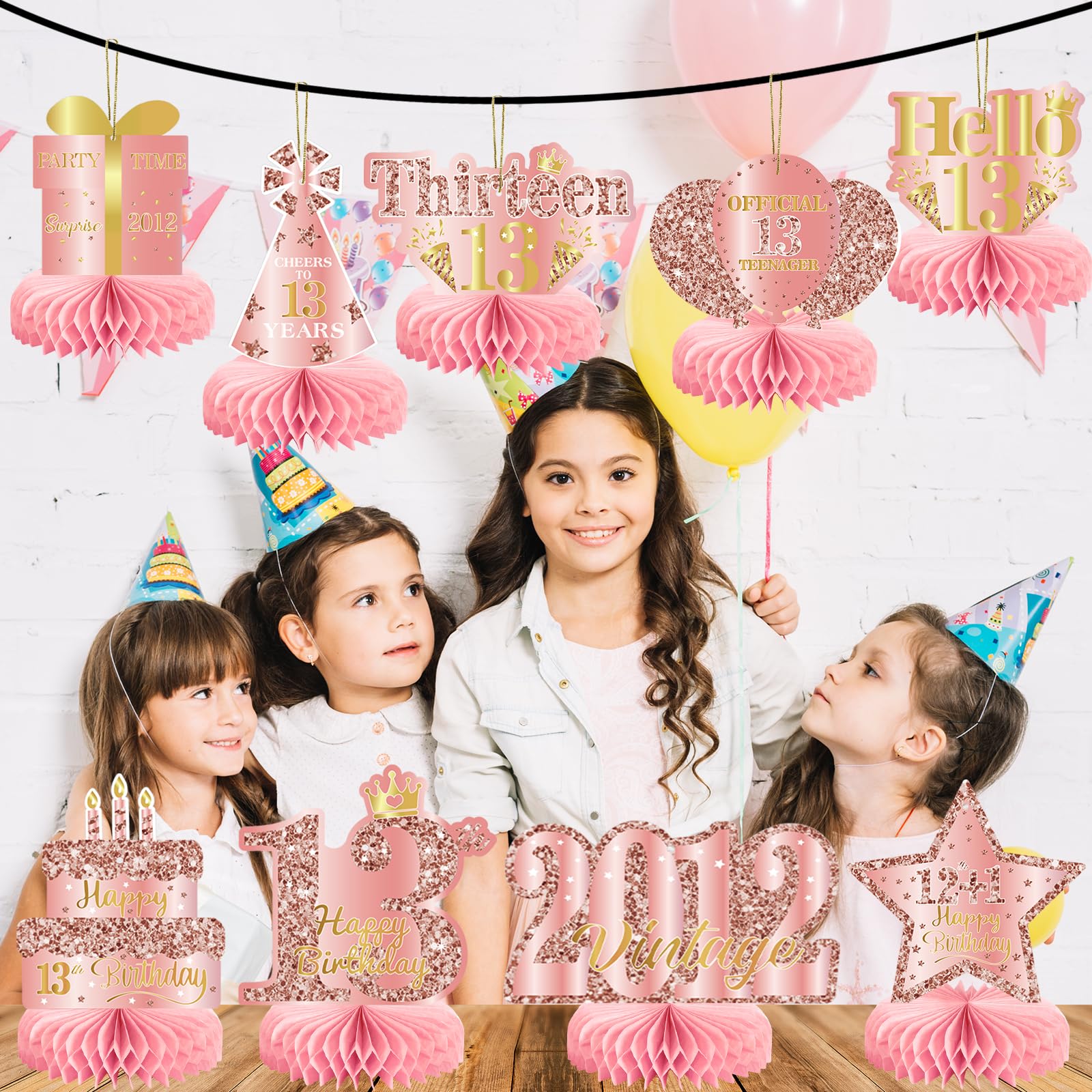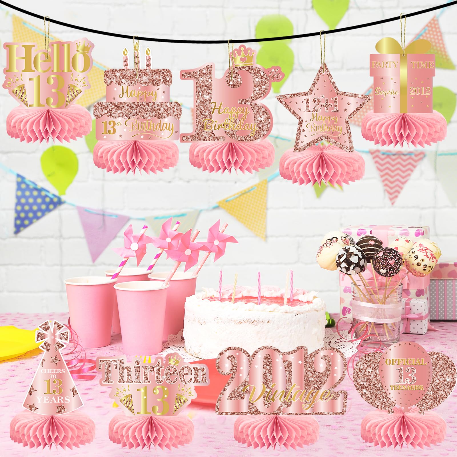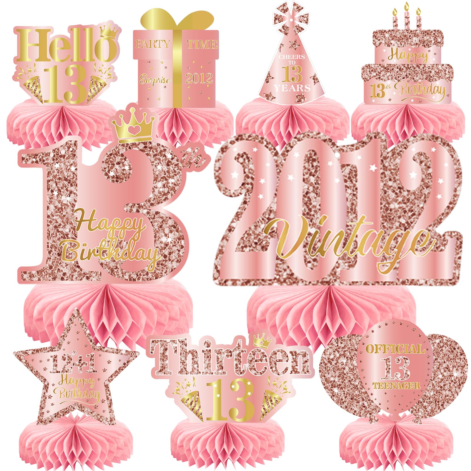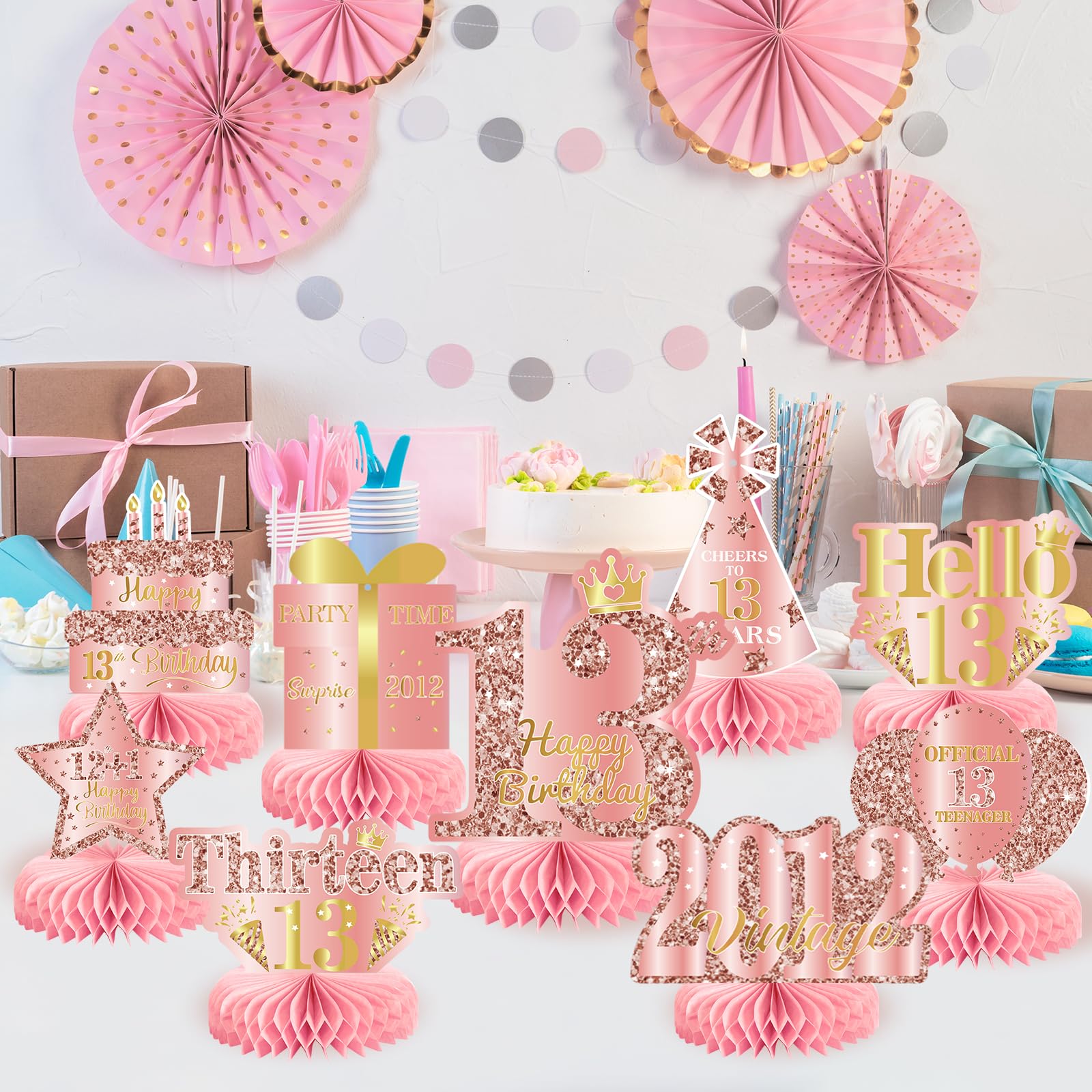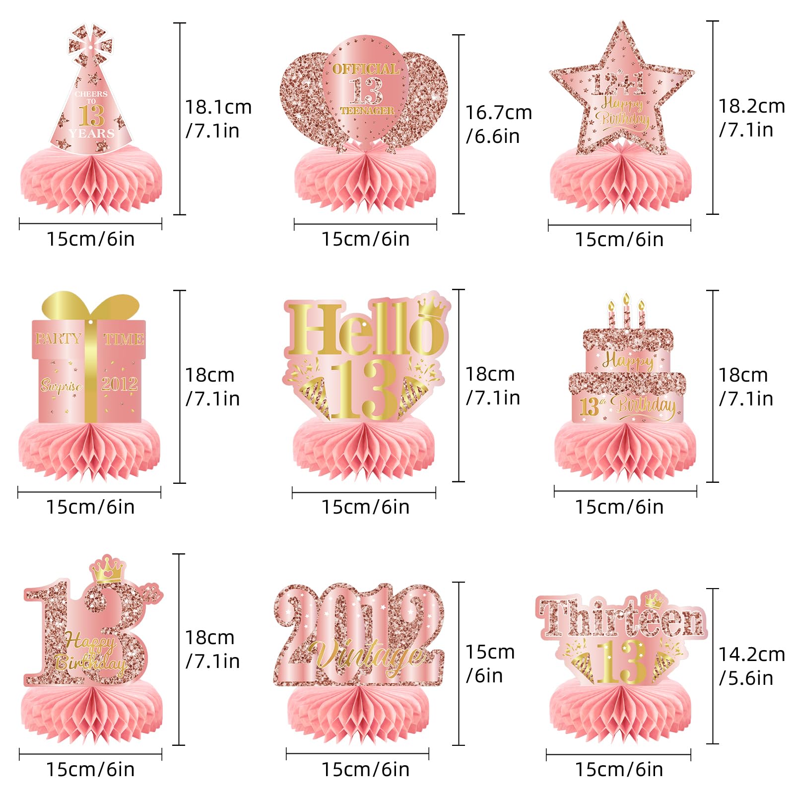 [You Will Get]- 9 pcs rose gold 13th birthday decorations honeycomb table centerpieces for girls, it contains 9 patterned cardboards and 9 paper honeycombs,and matching lanyards.These chic 13th birthday table decorations are enough to decorate your themed party.