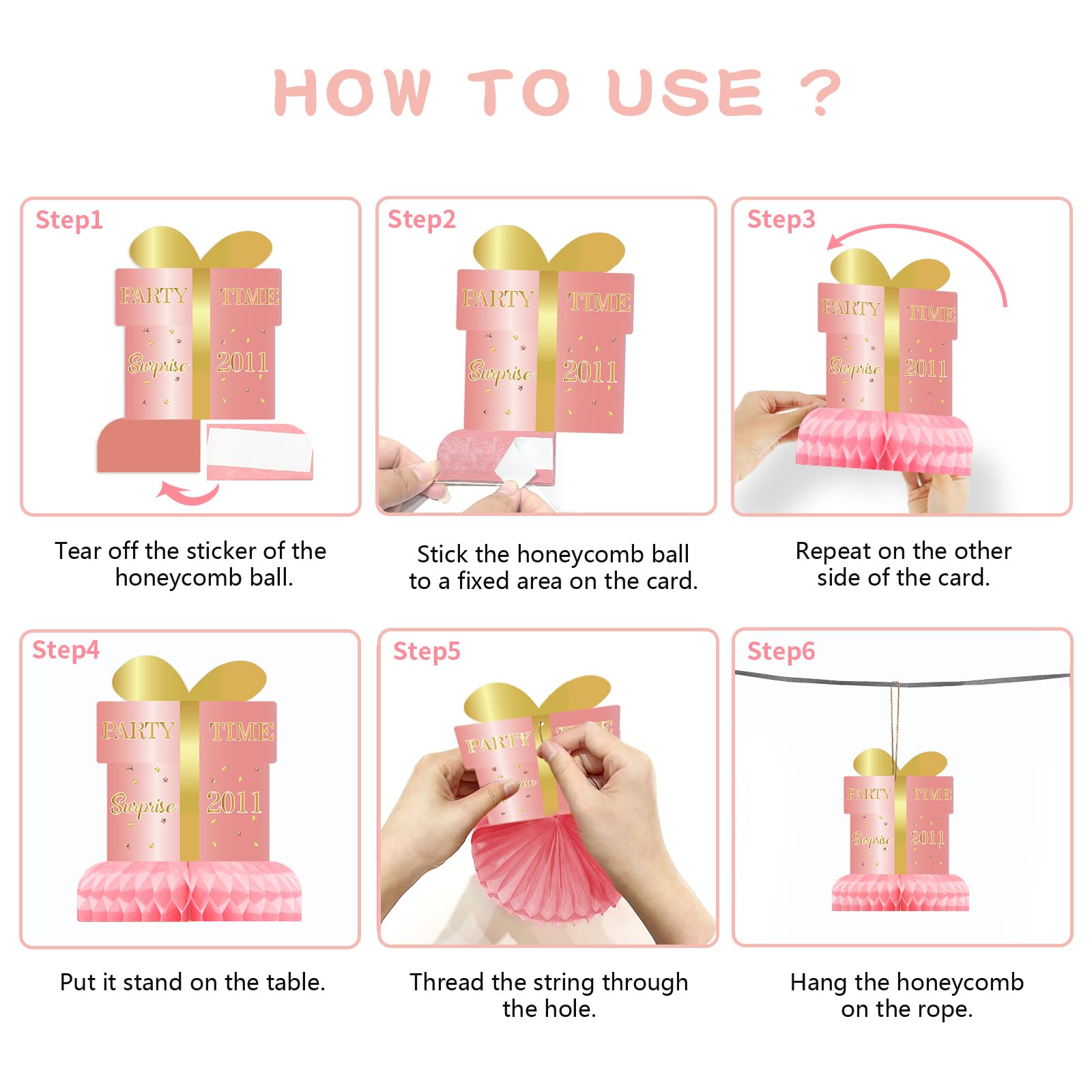 [Easy to Assemble] - Very easy to assemble. Step1, tear off the sticker of the honeycomb ball. Step 2, stick the honeycomb ball to a fixed area on the card. Step 3, repeat on the other side of the card. Step 4,finally put it stand on the table.Step 5,Thread the string through the hole.Step 6,Hang the honeycomb on the rope.