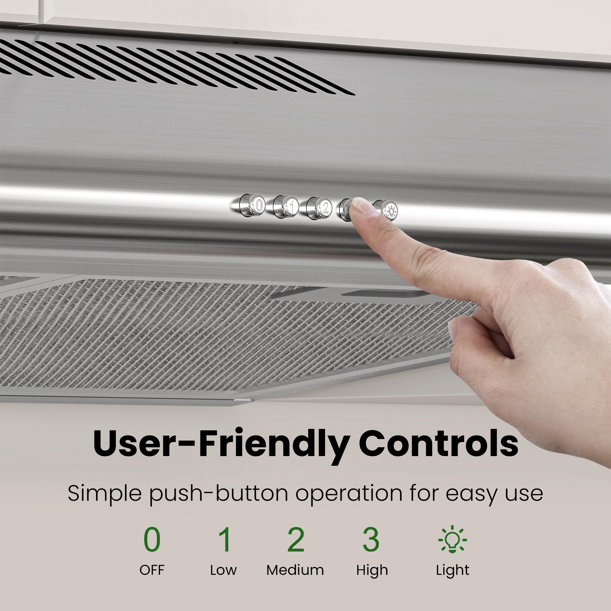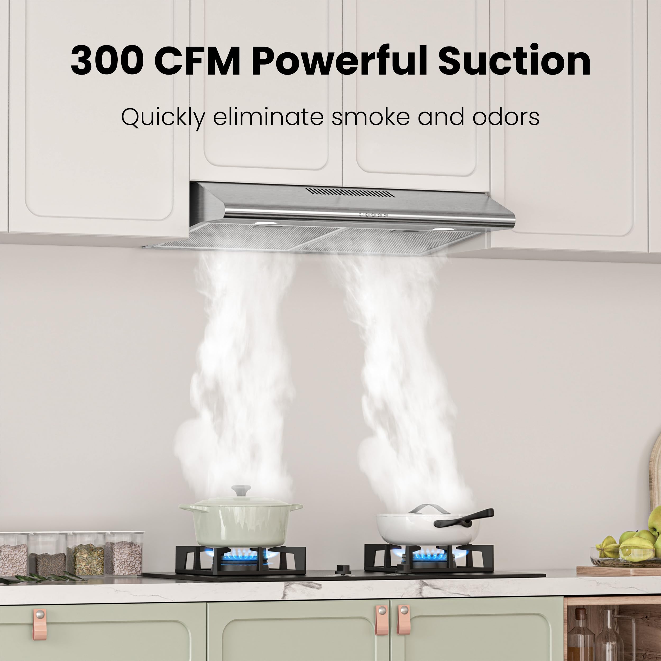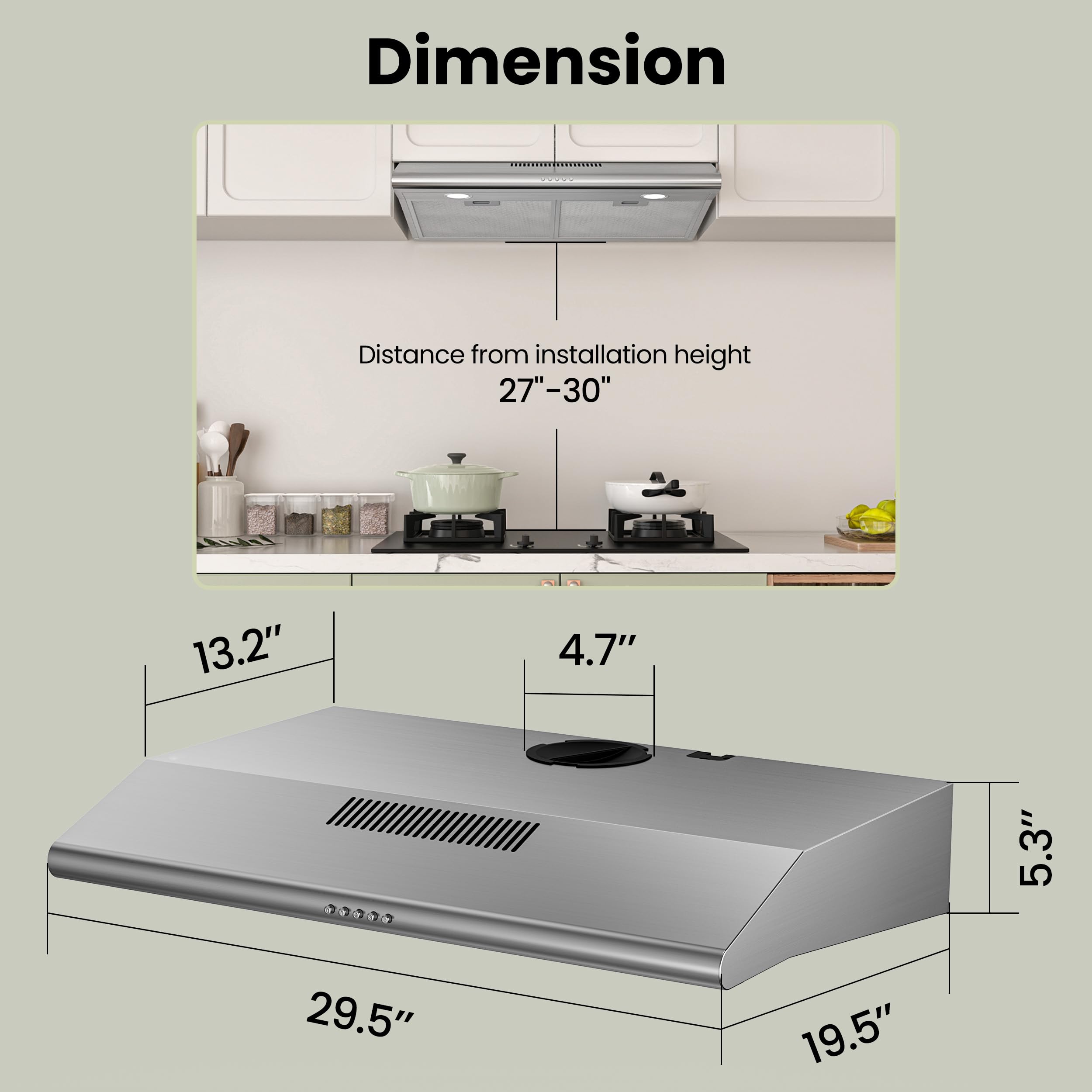POWERFUL BUT REALLY QUIET: Kitchen stove vent hood suitable for top or back venting.Can be install under cabinet or against a wall. Uses a 4.7-inch round duct for the range hood fan.Ultra quiet operation, noise of 30 inch vent hood less than 54dB at high speed