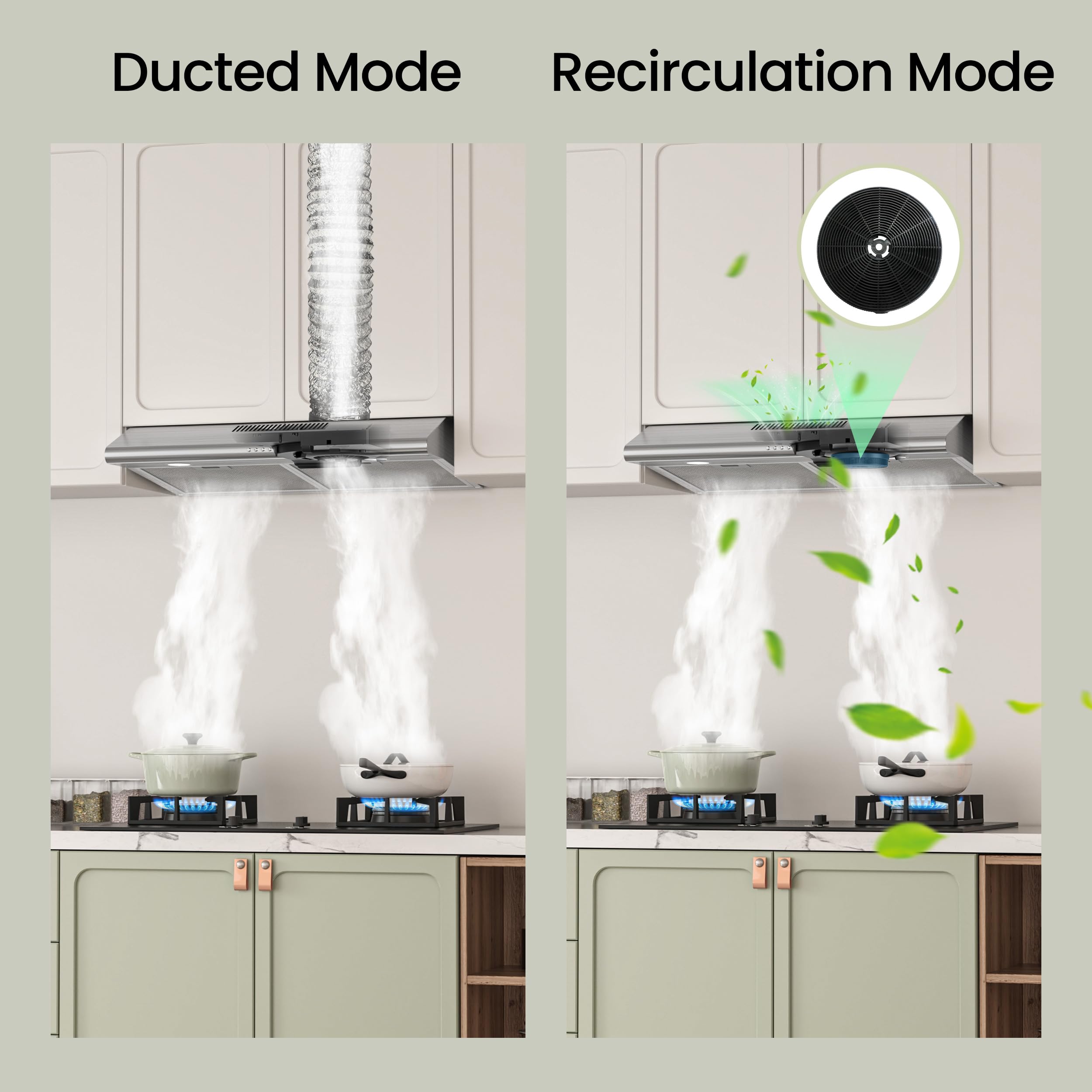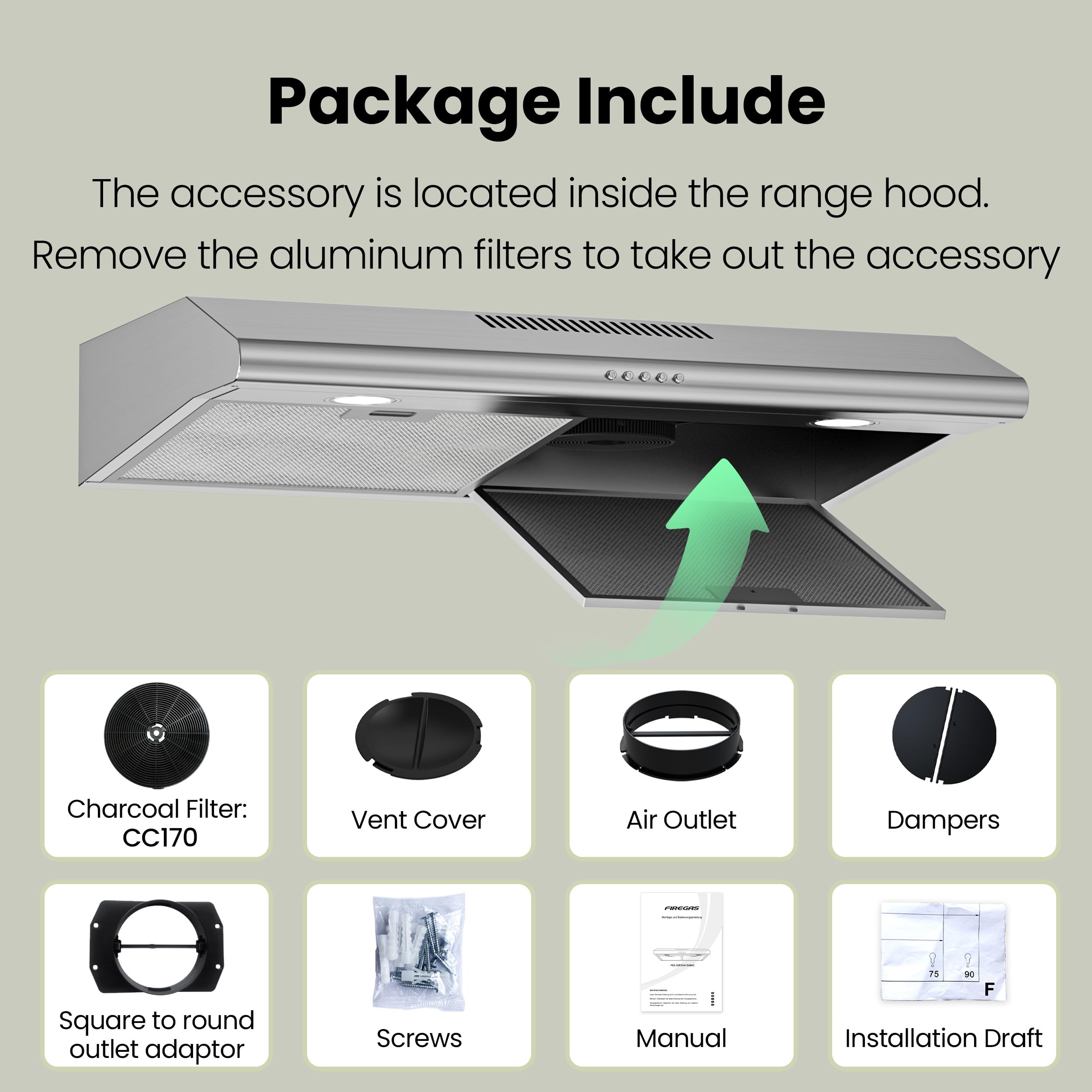 WORK EFFICIENTLY: This under cabinet range hood 30 inch has 3 speed exhaust fan and brand new motor will effectively removes smoke and odors,leave your kitchen cleaner and fresher.Space-saving slim profiles are great for condos and apartments.Ductless range hood can be convertible to ductless with carbon filter (come with charcoal filter CC170). Please remove blue protective film before installing