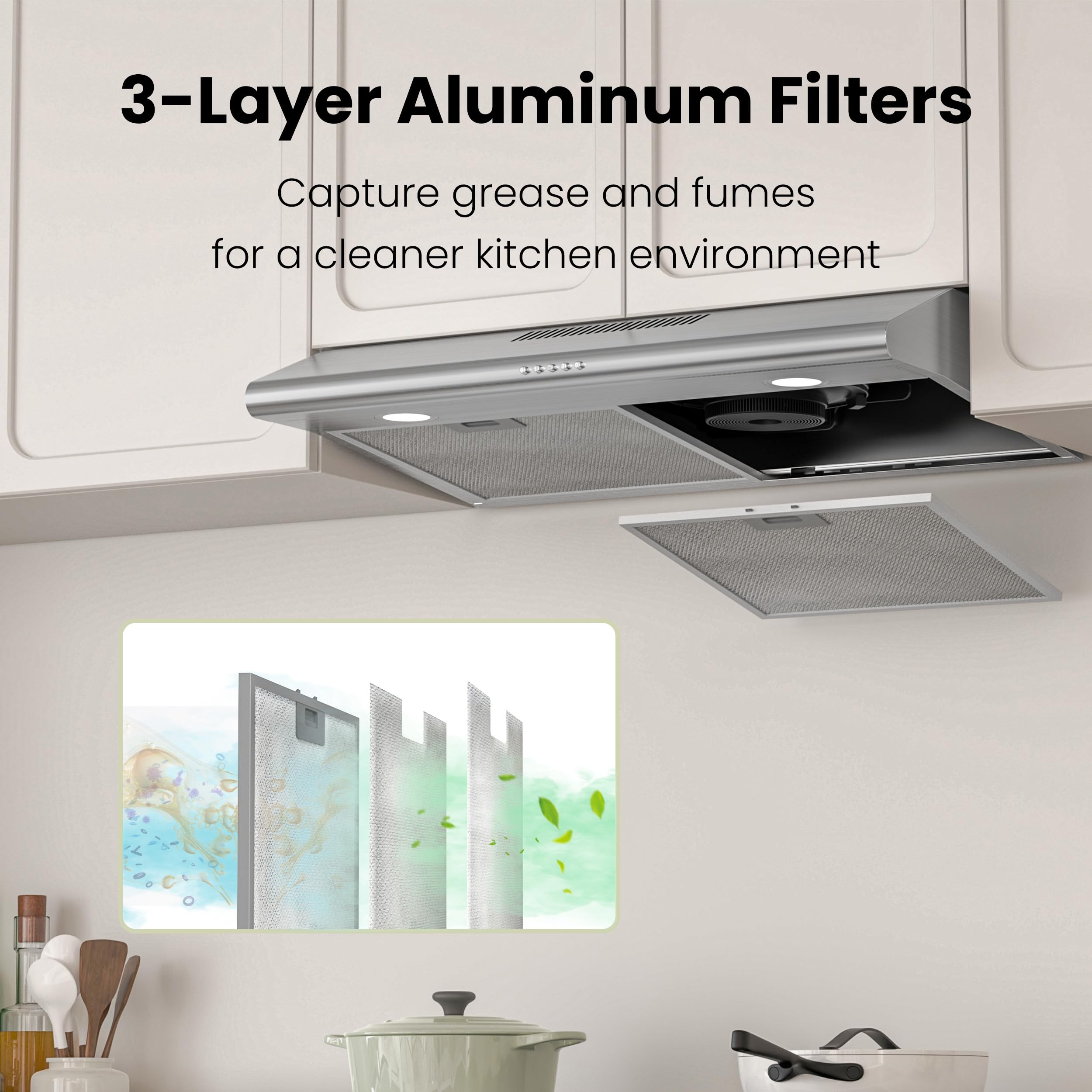 SLEEK AND ELEGANT LOOK: 20 gauge brushed stainless steel, 430-grade for unparalleled quality, very sleek and easy to clean, 30 inch range hood with 2x3-layer aluminum mesh filters, dishwasher safe and reusable. Trap grease and oil efficiently. Leave your kitchen clean with fresh air