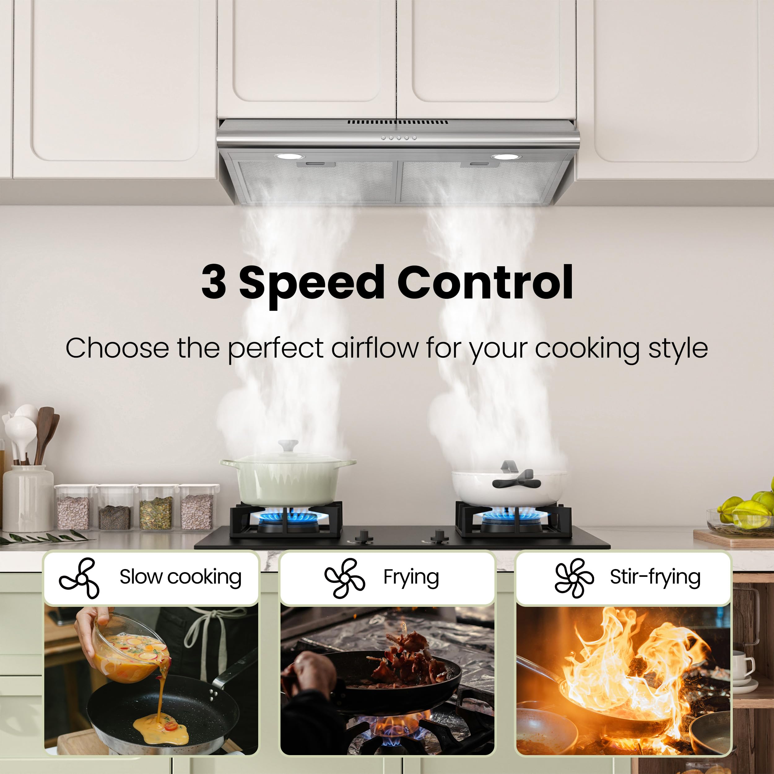 EASY TO INSTALL AND OPERATION: Easy to install with the instruction manual and the installation guide video. Easy 5-button controls, simple operate and sensitive reaction. Easy to turn on and off, Low/ Medium/ High Speed button suitable for different cooking method. 2 x 1.5W LED offer enough brightness to meet your cooking need