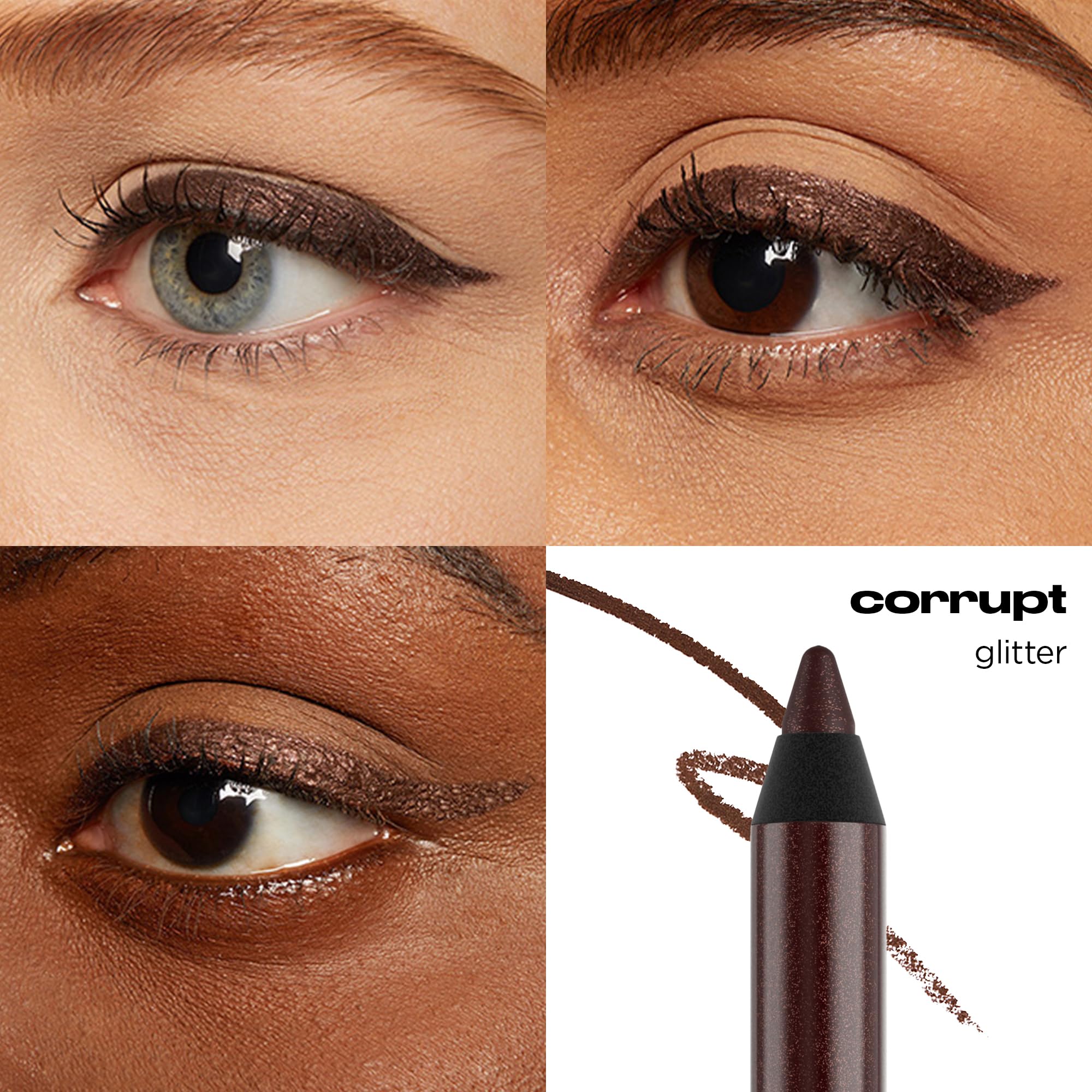 STAY SHARP - Keep your eyeliner sharp with Grind House Double Barrel Pencil Sharpener. Our vibrant shades come in matte, cream, shimmer, metallic & glitter finishes. Corrupt is dark metallic reddish brown with a silver micro-sparkle & shimmer finish.