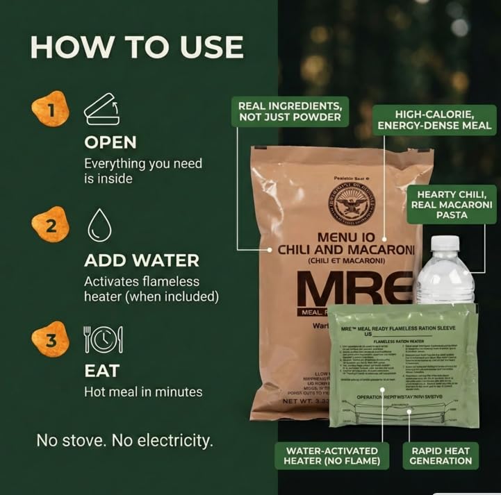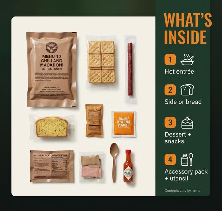 High-Calorie Nutrition – Each meal provides 1000–1300 calories, delivering essential nutrients for energy in demanding environments. Each MRE includes an entrée, side or bread, dessert, and accessory pack; some may include a flameless ration heater (FRH).