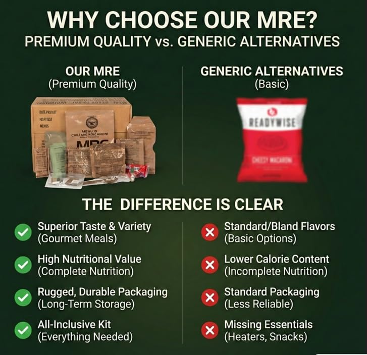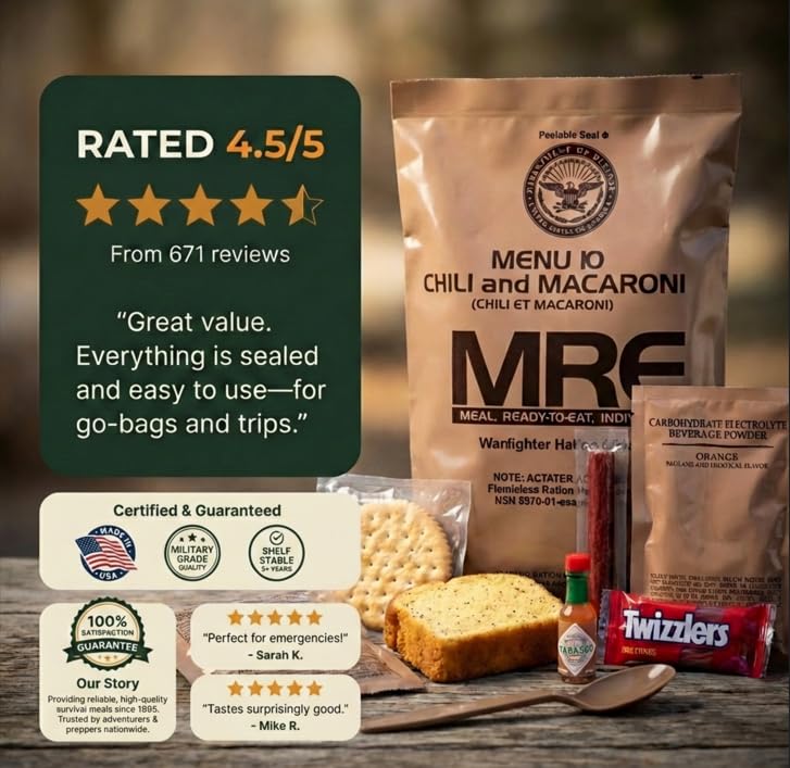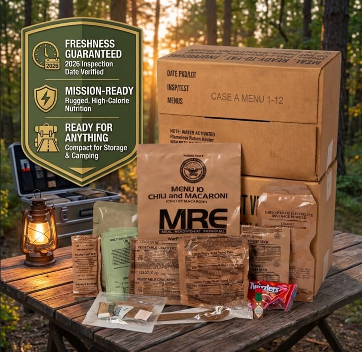 Military-Grade MRE Meals – Includes 24 complete, individually packaged meals with different menus; designed to meet U.S. military standards. Long Shelf Life - 2026 Inspection Date New Stock - meals remain shelf-stable for 10 years.