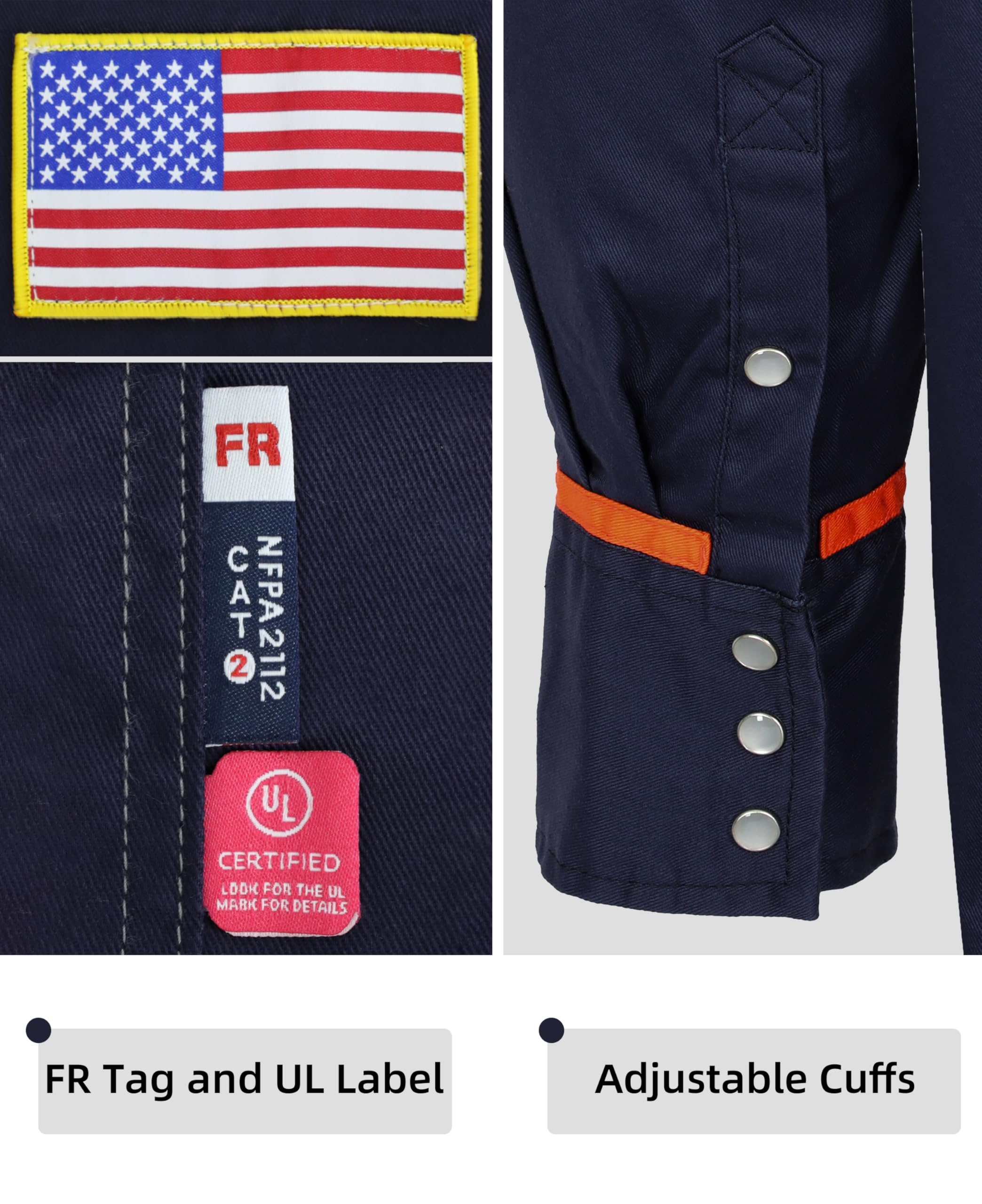 ENSURE SAFETY AT WORK :This garment meets or exceeds the standards for HRC2,Arc Rating Atpv 8.2 Calories/cm2 and the requirements of NFPA2112 Standard on Flame Resistant Garments for Protection of industrial Personal against Flash Fire,2012 Edition.Also NFPA70E ASTM F1506 and CAT II Classified!