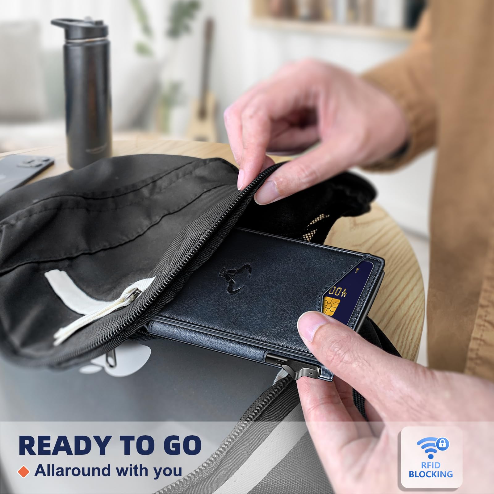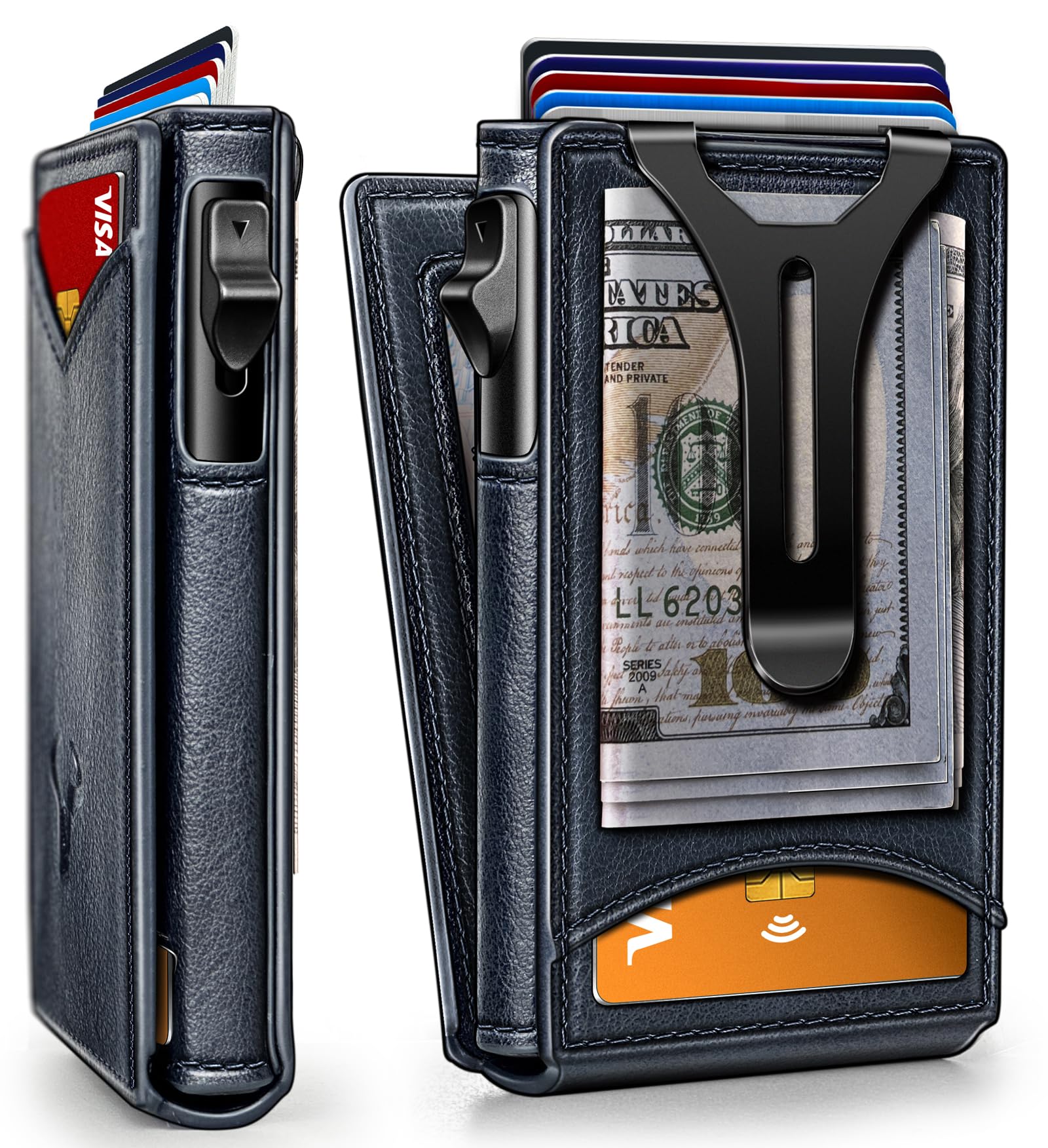 CAPACITY-Pop-up metal Case in flipping leather shell,9 card slots (including 1 ID window) and metal money clip for couple of bills;