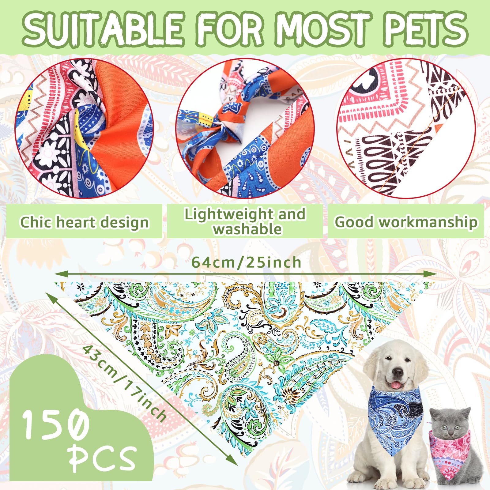 Value Pack: you will receive 150 pieces paisley dog bandanas, constructed with adequate quantity and styles, each style comes with 1 piece, can meet your various demands or replacements of your lovely pet dogs, making it easy to dress up your furry friend in style, or can be applied as a gift of style and comfort for your furry friends