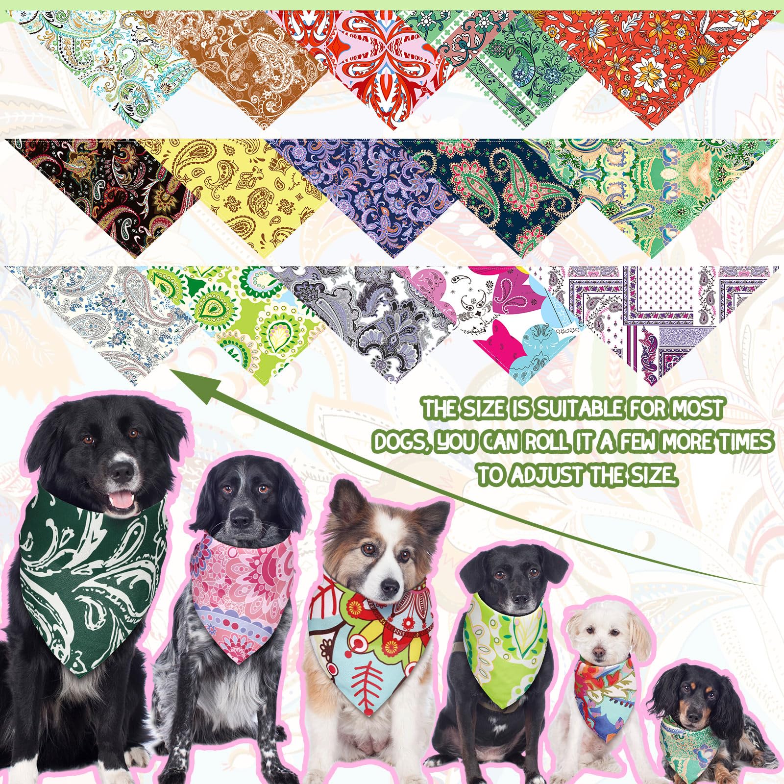 Bandanas for Dogs: our triangle dog scarf is deigned with one size, measuring about 64 x 43 x 43 cm/ 25 x 17 x 17 inch, fits most medium dogs, features with folded design, wearing these delicate bandanas, your pooch will be the talk of the town with their fashionable style; Note: please measure the neck circumference of your pets and leave room to tie knots
