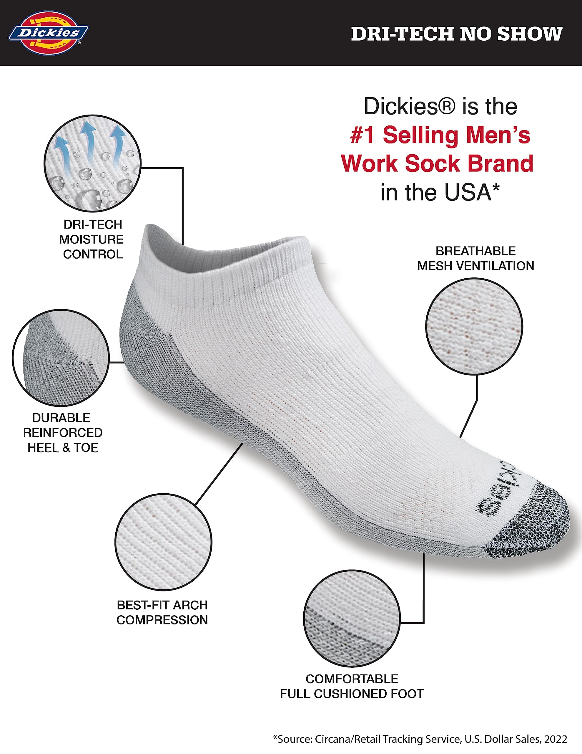 Description Dickies Dri-Tech comfort collection - combines moisture wicking fibers and mesh ventilation channels to keep feet dry and comfortable. Dickies delivers the right work socks for every worker at every job. Designed for feet that require comfort, durability, and quality at all times. We construct socks that provide features that are purpose-built. Dickies delivers the most complete work sock solution - covering more consumer needs with more products, in more categories than any other work line. For Over 100 Years Dickies has been making hard-duty work products built to stand up to whatever life throws at you. Dickies Work Socks are built with purpose to deliver superior comfort and performance on and off the job.
