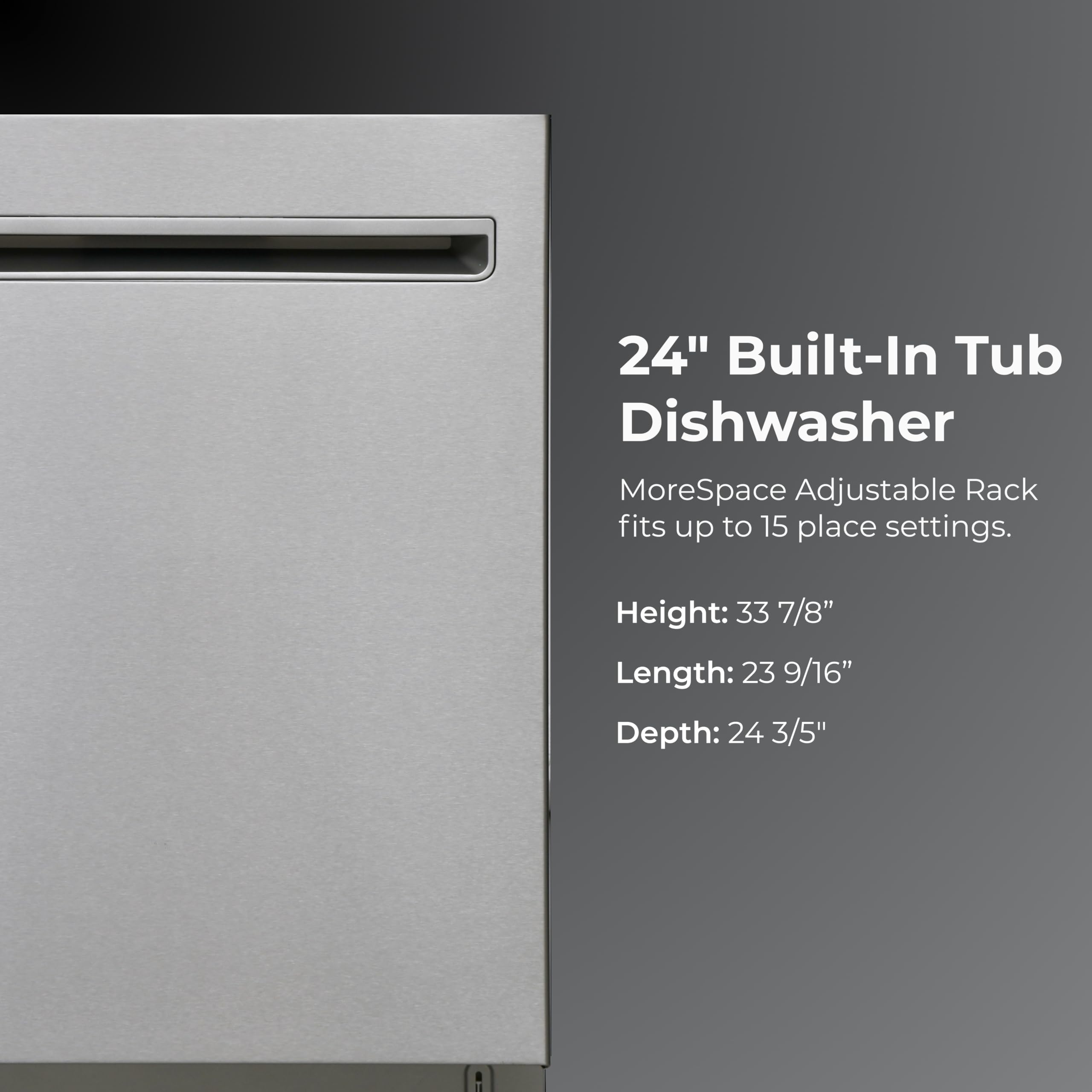 Tackle tough messes fast with the Kenmore 24" Built-In Dishwasher. UltraWash Plus uses 3 pressurized spray arms and filtered water to blast away stuck-on food from every angle. The SmartWash Cycle detects the amount of soil in the water and automatically adjusts water temperature, pressure, and cycle time for a customized clean that saves time and resources. When you’re in a hurry, the Accela Wash Option uses slightly more water and energy to deliver faster cleaning—perfect for back-to-back loads. TurboDry combines a built-in fan and heating element to remove moisture at the end of the cycle, even on plastic containers. The Extra Dry Option adds time and heat for a boost on hard-to-dry items. Fit up to 15 place settings in the spacious stainless steel tub, which resists stains and helps retain heat to improve drying. The flexible MoreSpace Adjustable Rack can be raised or lowered to fit tall cookware, awkward dishes, or delicate stemware. The 3-stage UltraWash Filter captures food particles as small as a grain of sand and drains them away, so they don’t redeposit on clean dishes. For added peace of mind, the built-in Leak Detect System monitors water flow throughout the cycle. If a problem is detected, the dishwasher will automatically drain the tub and alert you. The Quiet Wash Option reduces noise by adjusting wash temperature and cycle duration, so cleanup won't interrupt your evening. With the Delay Start Option, you can run the dishwasher on your schedule—up to 24 hours in advance. ENERGY STAR certified to help reduce energy and water usage with every load.