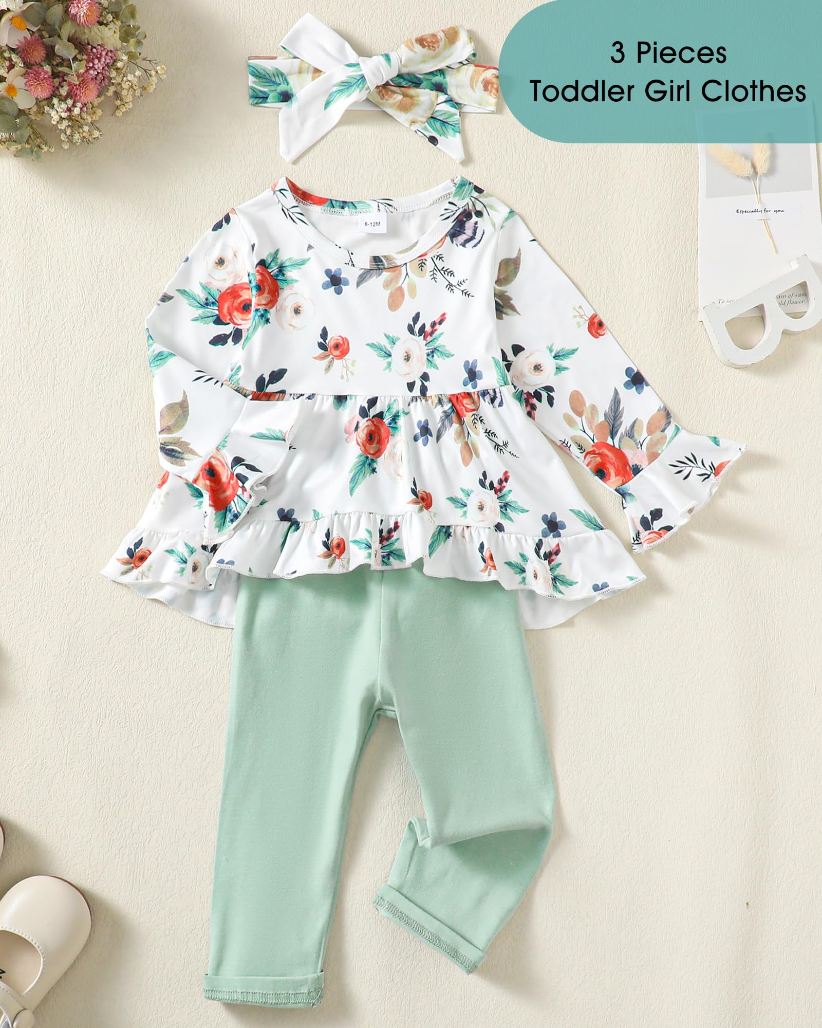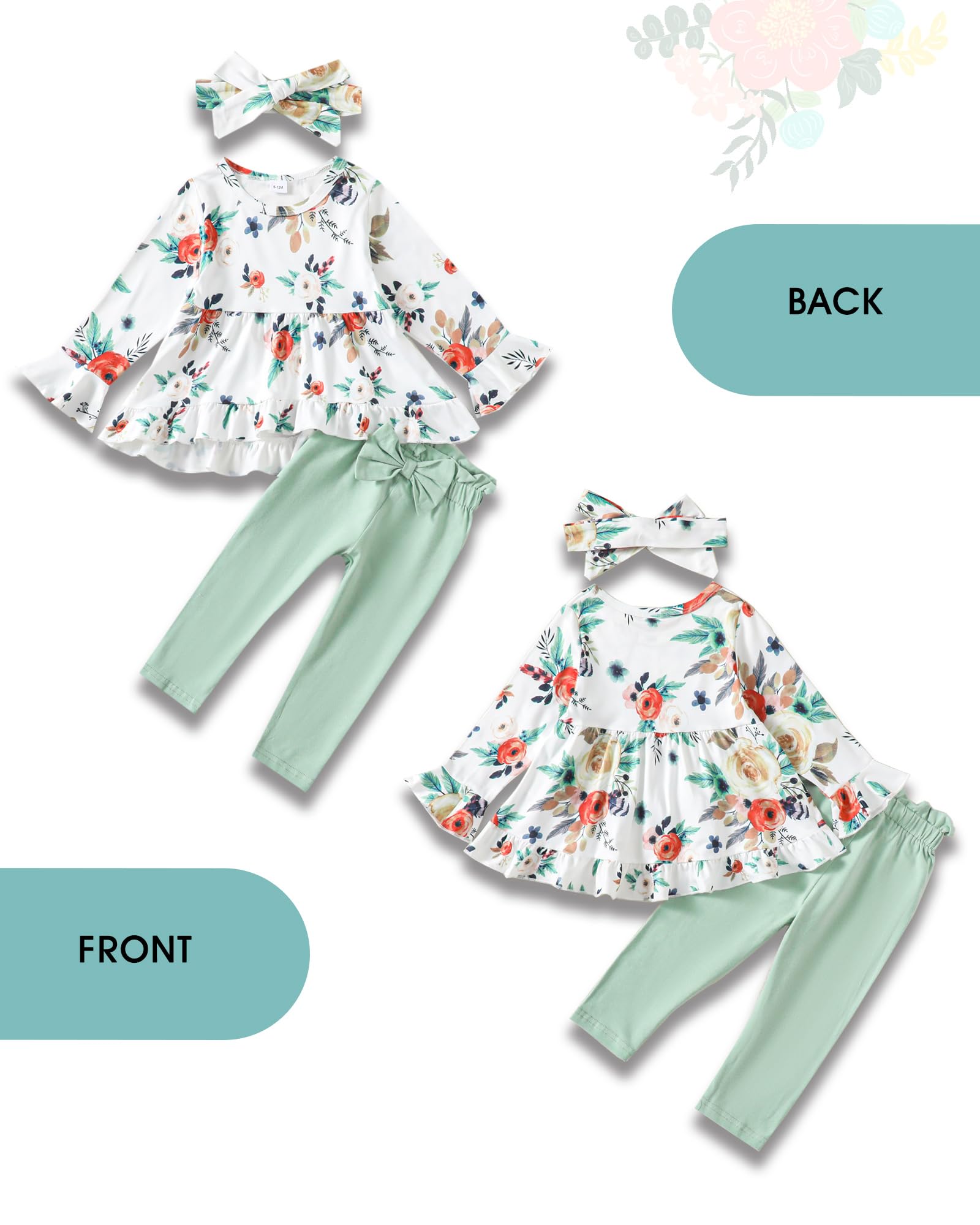 3 Pieces Toddler Little Girl Outift for Fall Winter: 1pc baby girl shirt + 1pc baby girl pants + 1pc untied headband