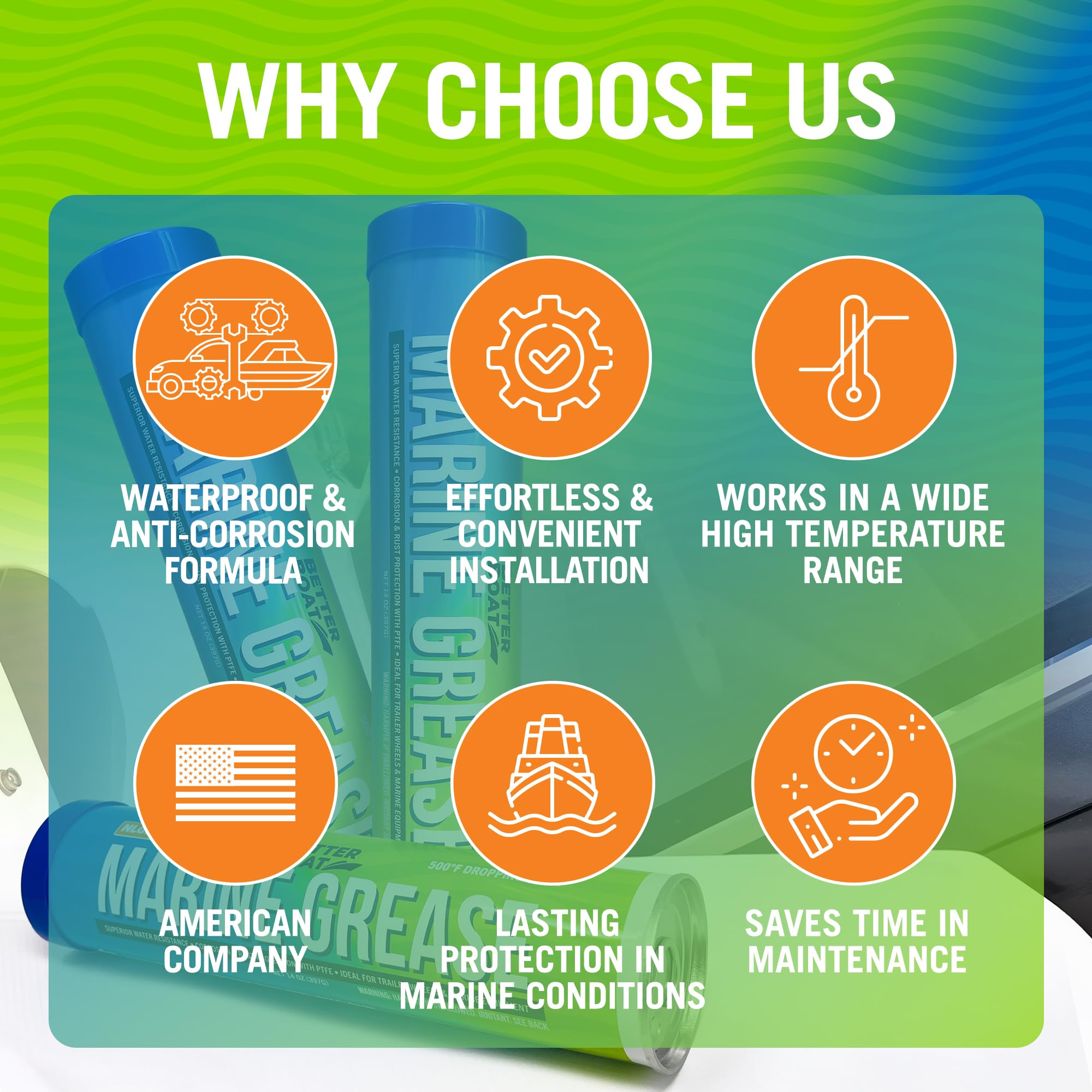 WHY BETTER BOAT: We are a family owned American business committed to making premium boating accessories. We stand behind your satisfaction and our marine grade boat accessories including our NLGI 2 grease cartridges for grease gun solutions.