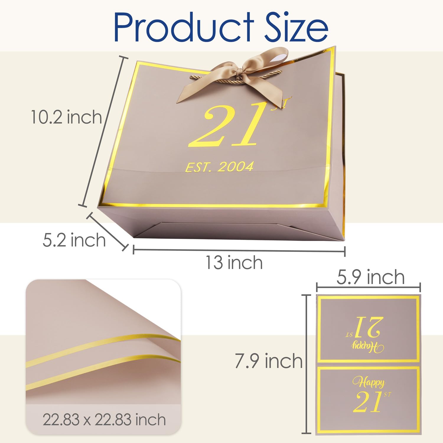 Personalized 21st Birthday Decorations for Him & Her: Each 21st birthday gift bag comes with 1 matching greeting card and 2 tissue papers.. The gift bag measures 13" length × 10.2" height × 5.2" width, the greeting card measures 7.9" length × 5.9" width, and the tissue paper measures 22.83" length × 22.83" width, providing a stylish presentation for your gifts.