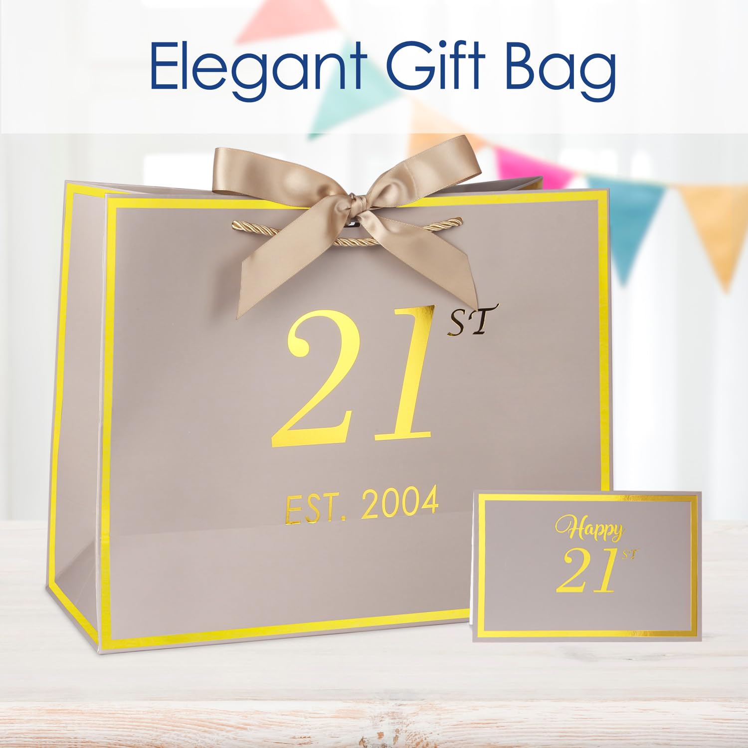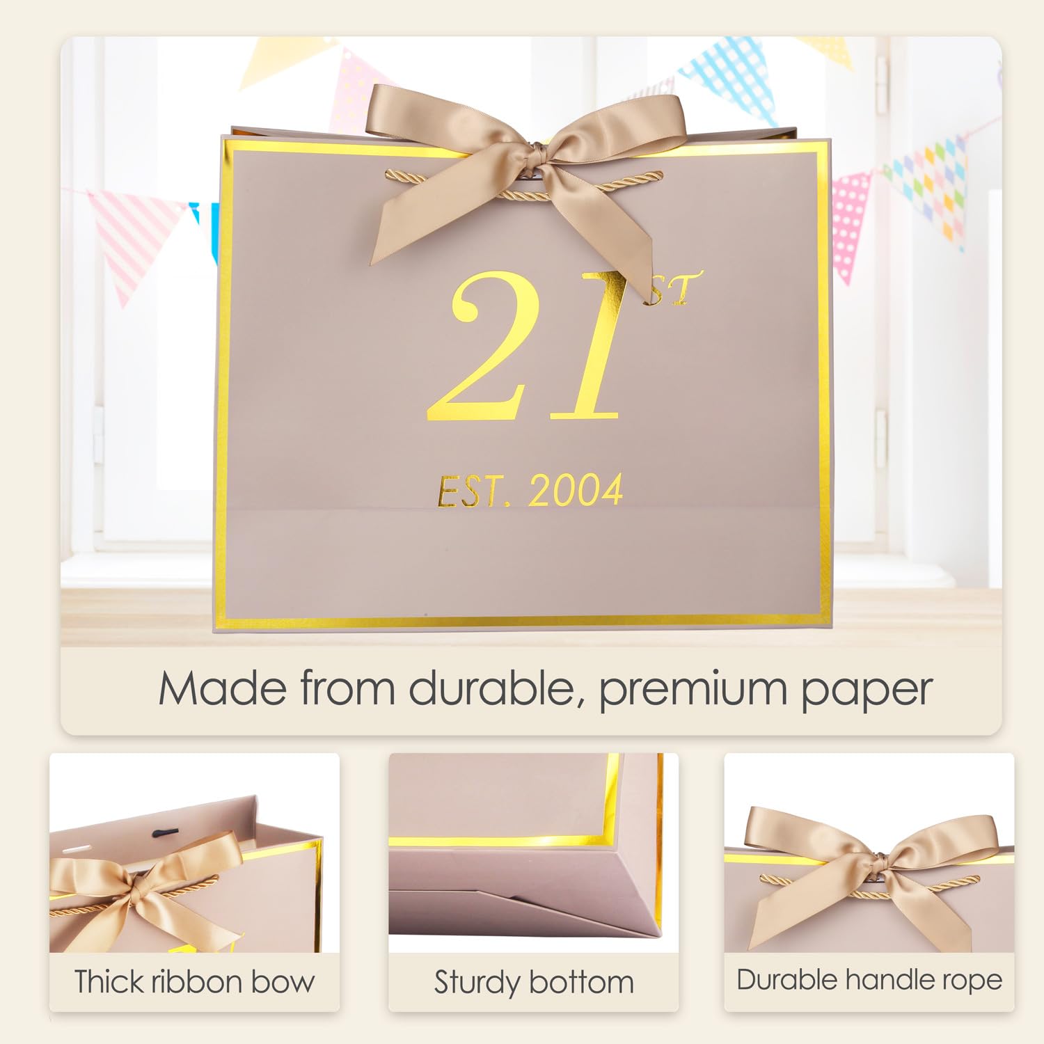 momoake 21st Birthday Gift Bag with Card and Tissue Paper for Men Women, 2004 21 Year Old 13" Elegant Khaki Gold Anniversary Keepsake Party Present Shopping Paper Bags for 21st Birthday Decorations