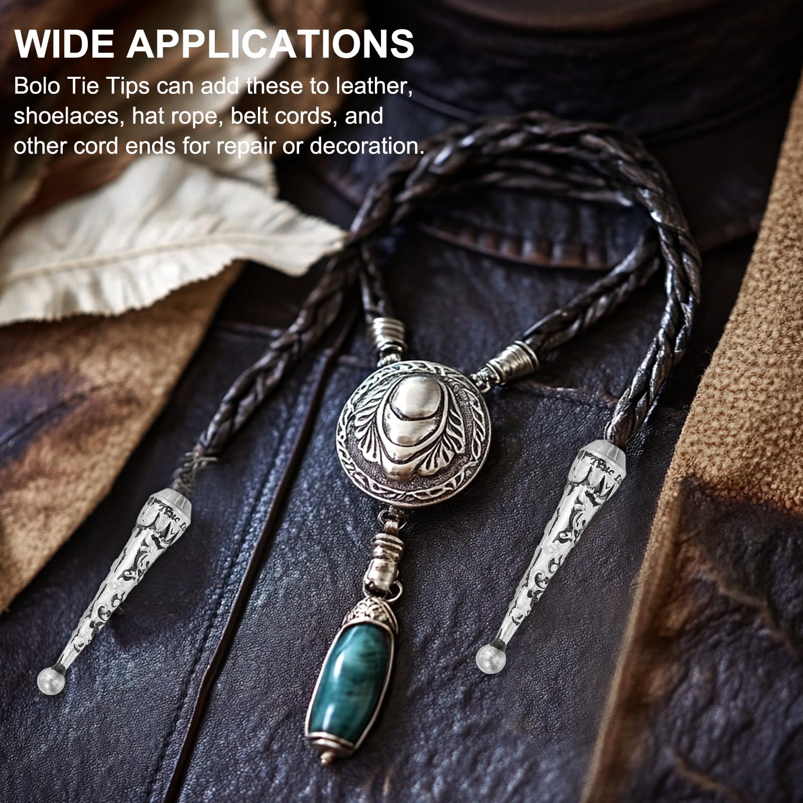 Application: The bolo tie replacement end caps are great for making your DIY bolo tie, and you can also add these to leather, shoelaces, hat rope, belt cords, and other cord ends for repair or decoration.