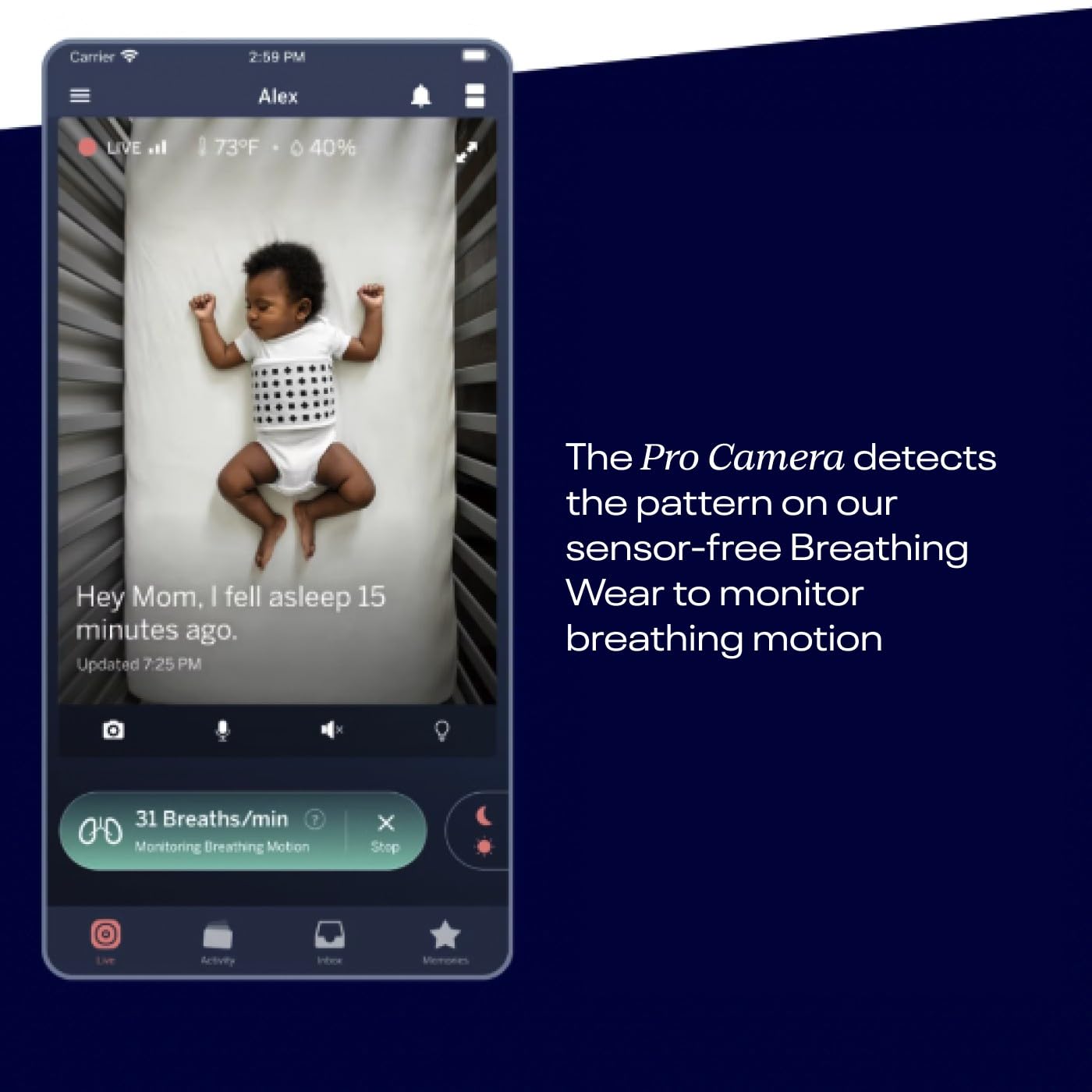 Sensor-Free Breathing Motion Monitoring: The custom-designed pattern on Nanit Breathing Wear is tracked by the Nanit Baby Monitor Camera to see your baby's breathing motion, in almost any sleeping position, without any electronics or sensors touching your baby's skin