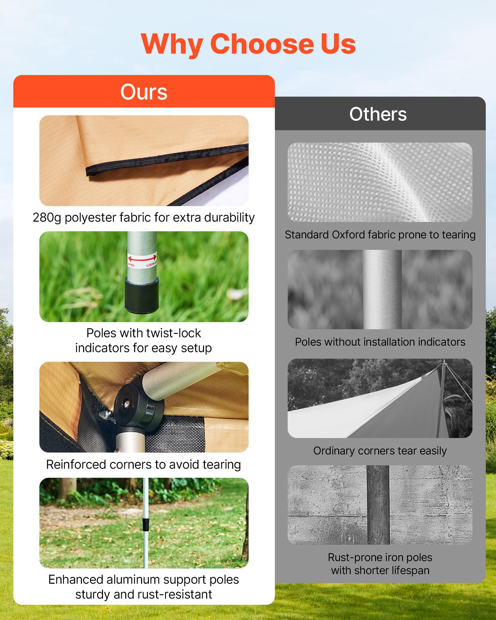 Quick Setup: Telescopic structure with pre-installed top and support poles simplifies installation. Our SUV awning includes detailed instructions, allowing even beginners to set up in minutes