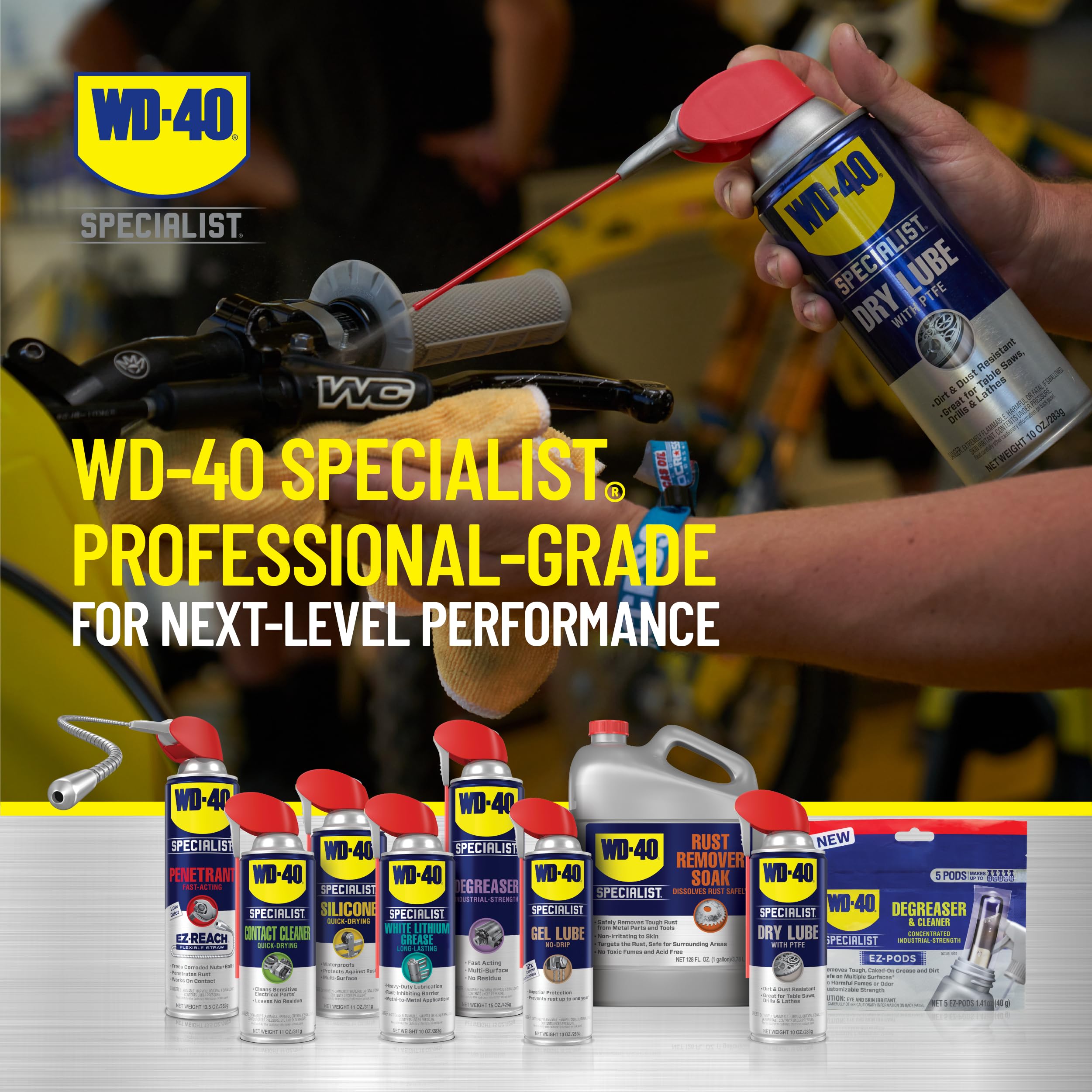 A dry lubricant that keeps your equipment running smoothly with long-lasting corrosion protection that does not attract dirt, dust, or oil. WD-40 Specialist Dry Lube with PTFE provides superior lubrication and long-lasting corrosion protection with no oily residue. Best used where cleanliness and maximum performance are required as it dries quick leaving behind a lubricating film that resists dirt, dust and oil buildups. Great for reducing friction and wear on blades and bits, door and window tracks, slides, conveyor belts, rollers, hinges, table saws, lathes, power tools and equipment. Effective in temperatures ranging from -50°F to 500°F. -Provides 5x greater wear protection than the competition for longer-lasting lubrication and reduced application frequency* -Lubricates at least 4x longer than the competition** - Safe to use on wood, paper, fabrics, leather, metal, rubber and most plastics (except clear polycarbonate and polystyrene). - NSF Category H2 (#146856) *Test Lab: WD-40 Co. Technical Center (Pine Brook, NJ); ASTM D4172; Test date: 12/2020. ** Test Lab: WD-40 Co. Technical Center (Pine Brook, NJ); ASTM D4172 Modified; Test date: 04/2021.