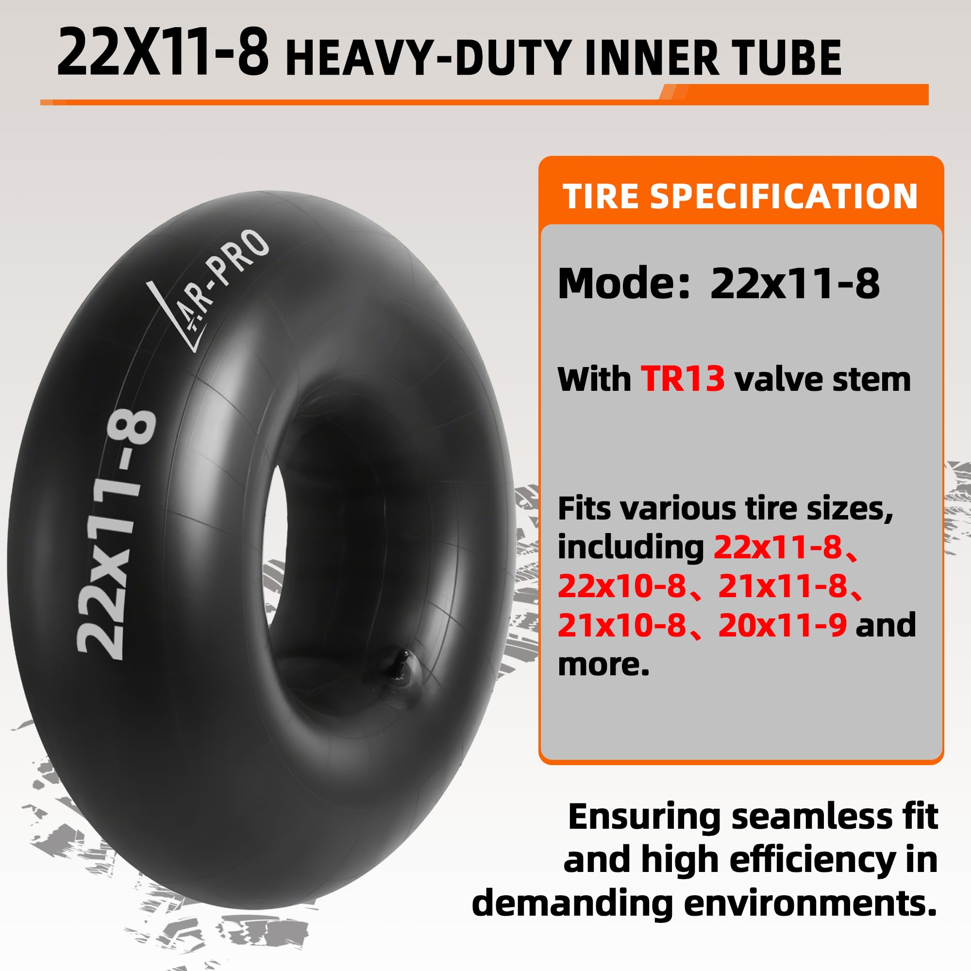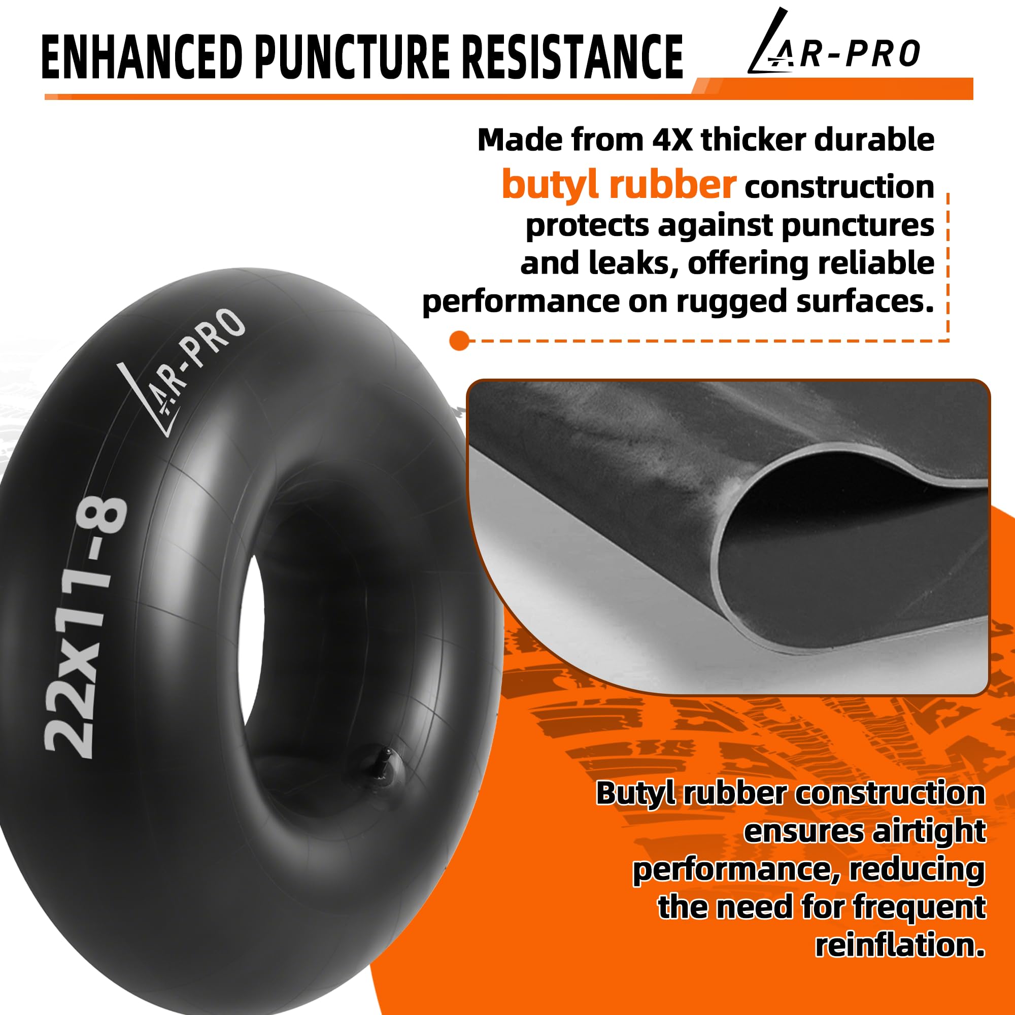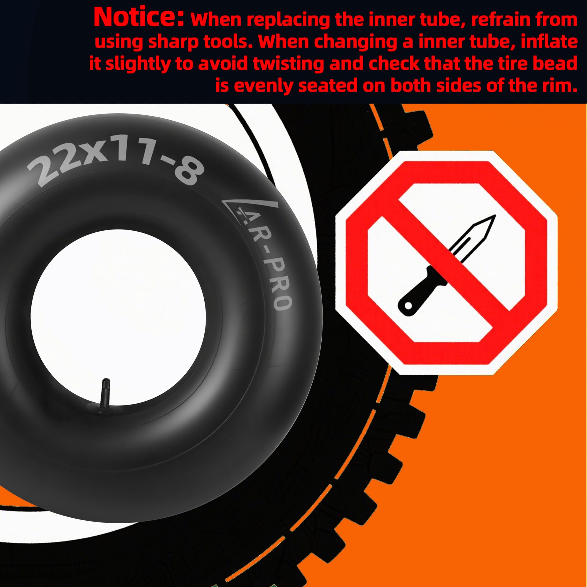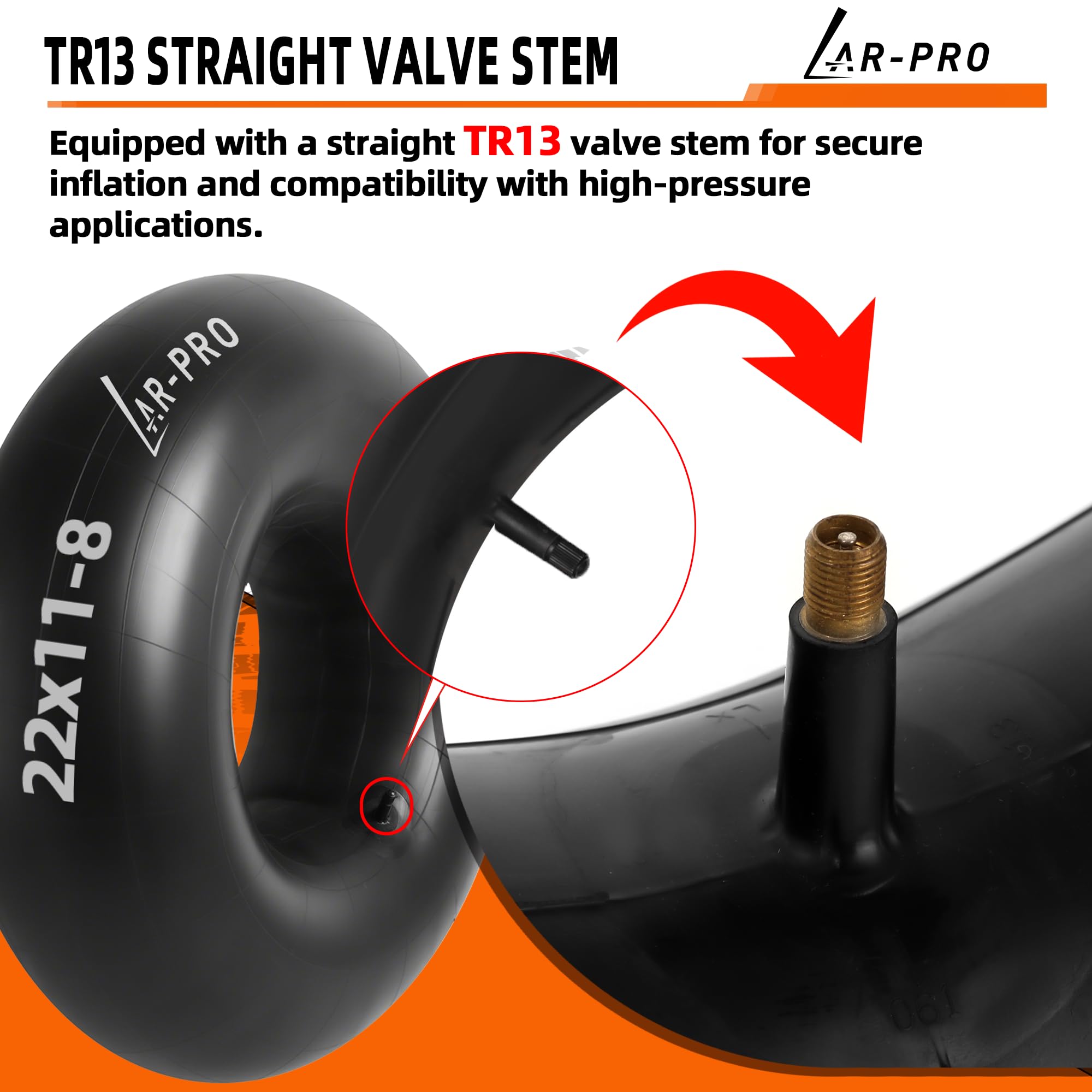 Heavy-Duty Inner Tube: Durable 22x11x8 butyl rubber inner tube with TR-13 straight valve stem, designed for ATVs, lawn mower, tractors, garden trailers, wagons, golf carts, quad bikes, snow blowers and most lawn equipment tires. Ensuring seamless fit and high efficiency in demanding environments.