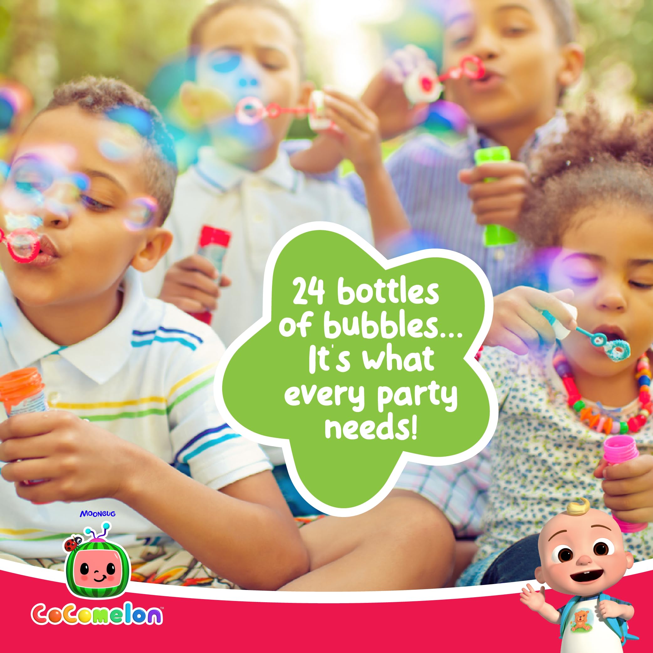 PACKAGE INCLUDES: 24 4 oz. Cocomelon bubbles. Each bottle includes a wand and 4-oz. of bubble solution