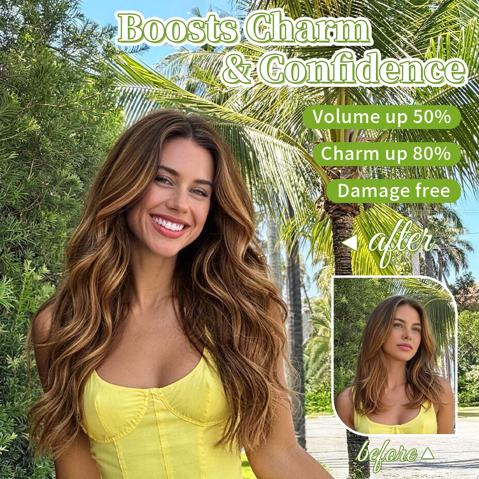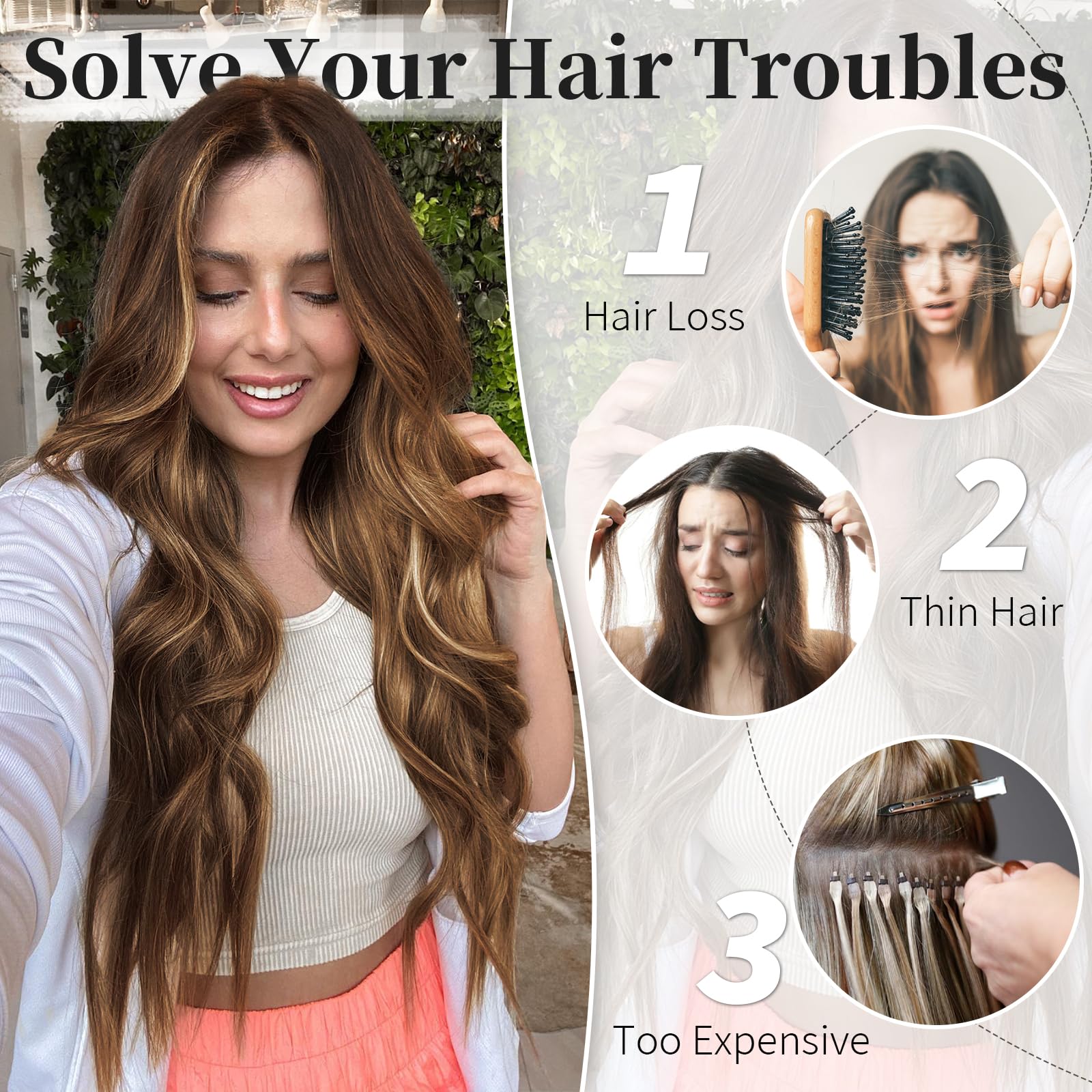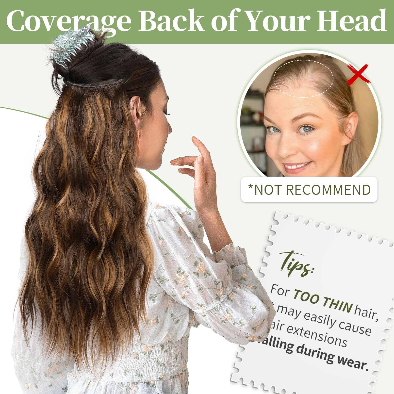 Different ways of wearing: 1. Position the wire hair extensions on your head like a headband, secure them with 4 clips, and hide the wires with your own hair.2. Only use invisible wires, suitable for easy hair loss and sensitive to clips customers. 3. Only use 4 hair clips, suitable for customers with soft and sparse hair on the top of the head.