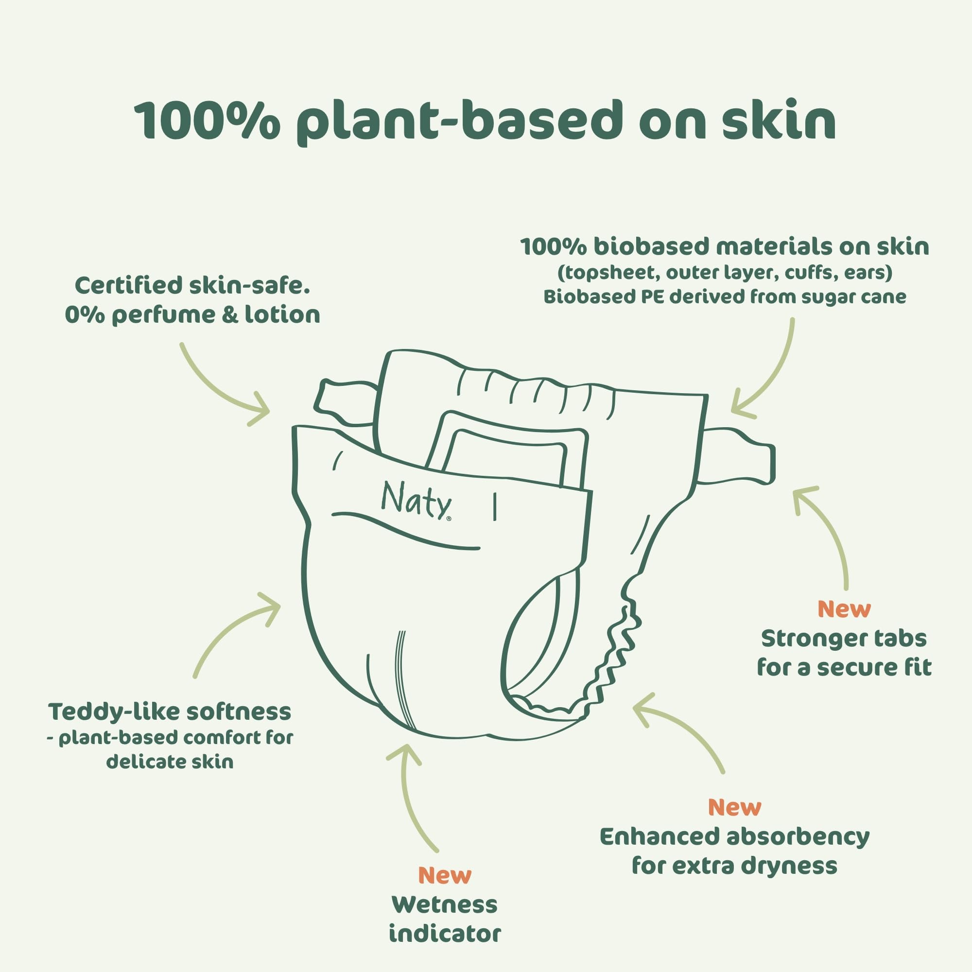 Naty BioEmbrace is our next-generation diaperโevolved from Natyโs award-winning original range to offer even better comfort, care, and absorbency. Itโs the only diaper certified 100% biobased on skin (liner, outer layer, cuffs, ears), with no fossil-based plastic in contact with your baby. Super soft from day one, its plant-based surface delivers a teddy-like touch while remaining breathable and gentle. Verified to strict safety standards against 1,000+ substances incl. chlorine, PFAS, parabens, phthalates (Oeko-Tex Standard 100). Dermatologically rated โExcellentโ by Dermatest. Vegan, FSC-certified, and developed in Sweden since 1994. Available in sizes 1โ6 for comfort from newborn to toddler. Previously Eco by Natyโnow simply Naty.