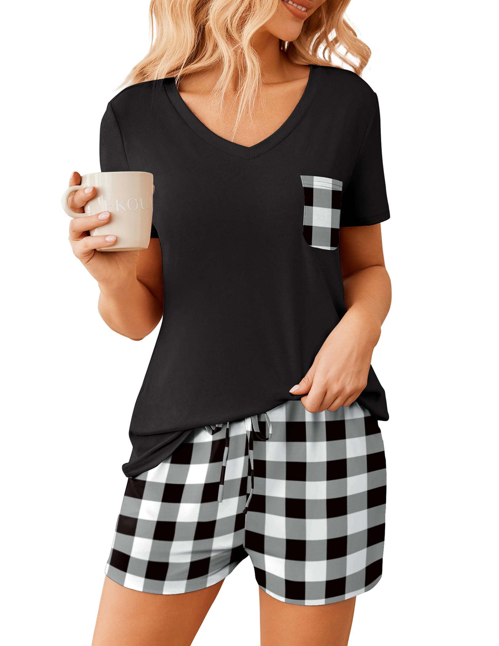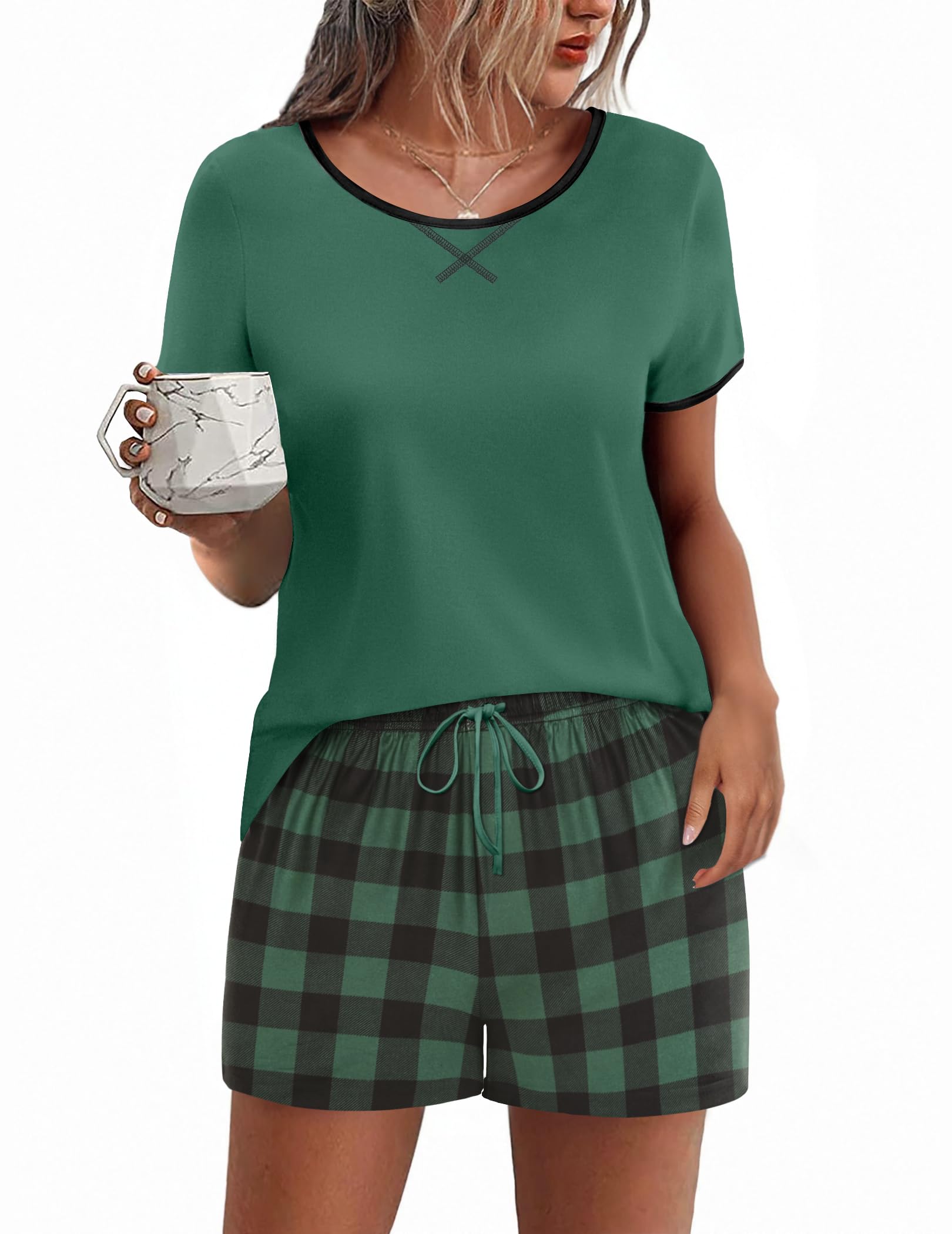 Two Piece Pajama Set: Top- with Round-neck,short sleeve,stylish color block, Pj Short- with Elastic waist,classic plaid & print,which suitable for every age group. Nice design Short Pajama Set for a relaxing day and night