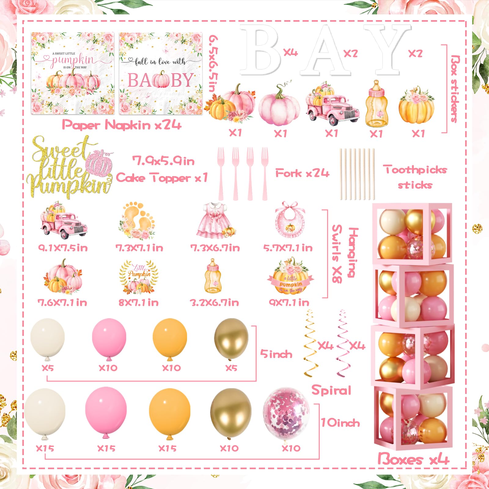 【Little Pumpkin Baby Shower Decorations】Includes:1pc gold glitter banner,8pcs hanging spiral banner (different designs),48pcs dinner plates(9in and 7in),24pcs fork,24pcs napkin(6.5in*6.5in),1pc a little pumpkin is on the way baby shower backdrop,4pcs pumpkin boxes,1pc "Oh Baby" foil balloon,1pc 86.6in*51.1in tablecloth,1pc pumpkin baby shower poster(8”x10”),2pcs tinplate badge pin,65pcs 10’’ latex balloon and 30pcs 5” latex balloon(5 colors),1pc “Mommy to Be” sash,5pcs paper cut-outs(with glue dots),1pc sweet little pumpkin cake topper,24pcs cupcake toppers and a set of balloon tools.