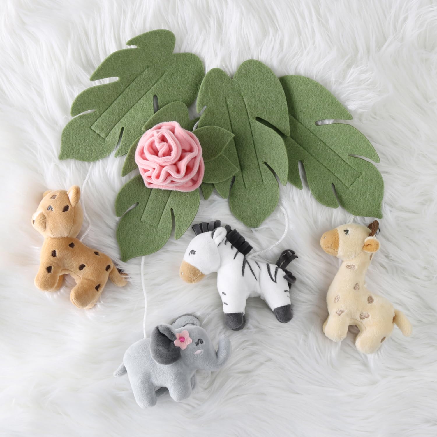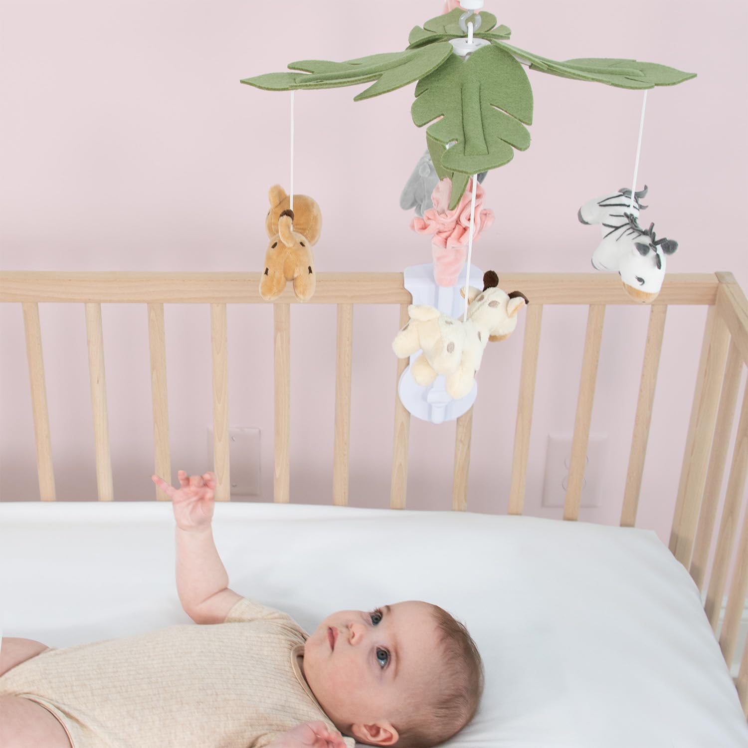 Wildest Explorer: Bring the fantasy floral animals to your baby girl's crib mobile with a plush giraffe, elephant, leopard, and zebra in soft pink, green and neutral hues. The mobile crib gently rotates, adding a fun safari theme to your nursery room.