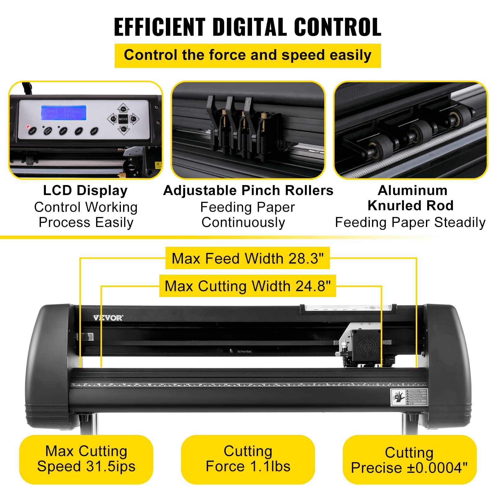 Efficient Digital Control: The max feed width: 28.3 in / 720 mm; the max cutting width: 24.8 in / 630 mm. This Vinyl cutter machine is equipped with an LCD to control speed and force quickly. Besides, the three adjustable double-spring pinch rollers and aluminum knurled rods ensure the vinyl plotter feeding paper steadily without paper jam.