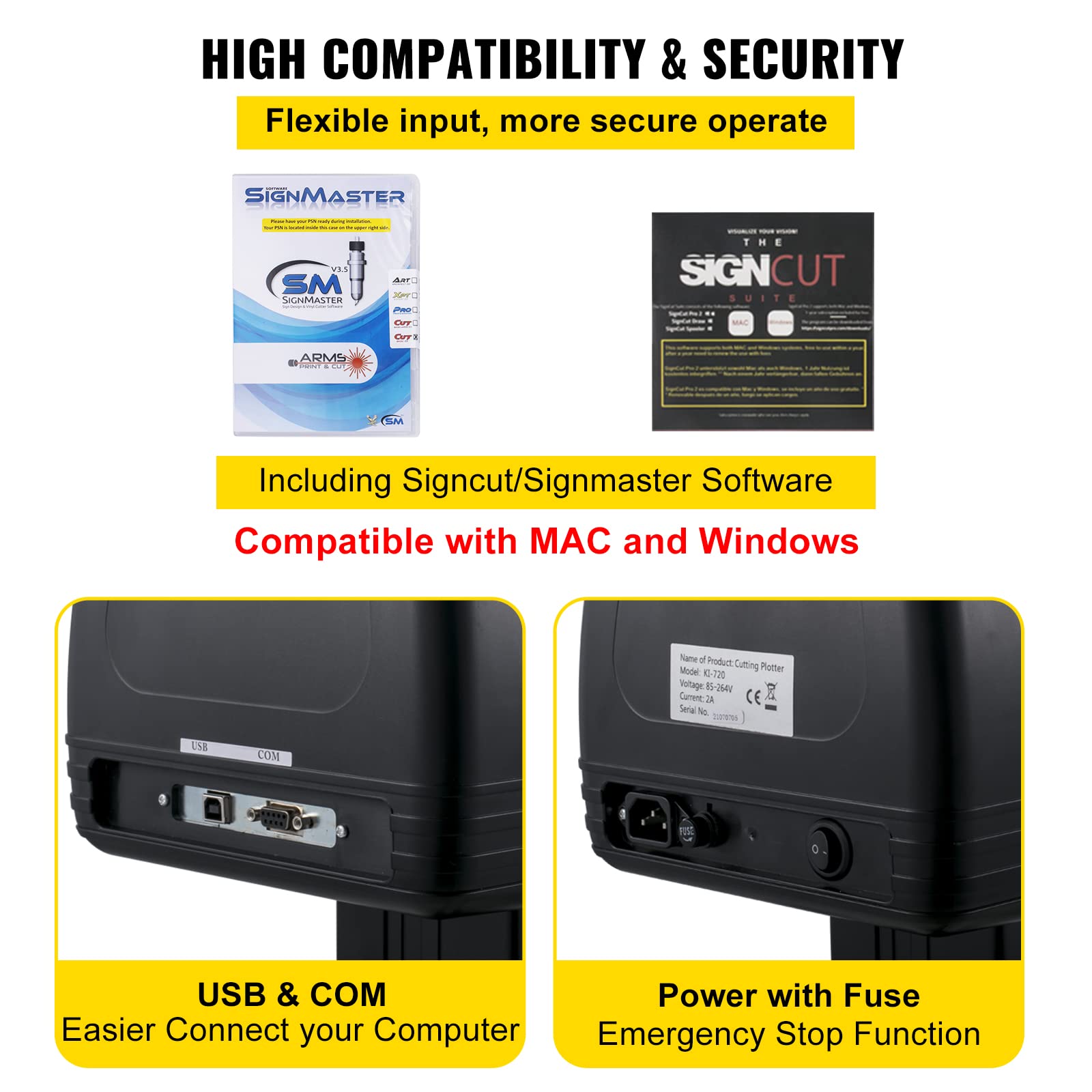 High Compatibility & Security: This plotter cutter vinyl includes the signcut and signmaster software that works with MAC and Windows via USB or serial port. It also supports other software such as graph-cut and flexi. There is power with fuse possesses of emergency stop function to prevent you from the danger.