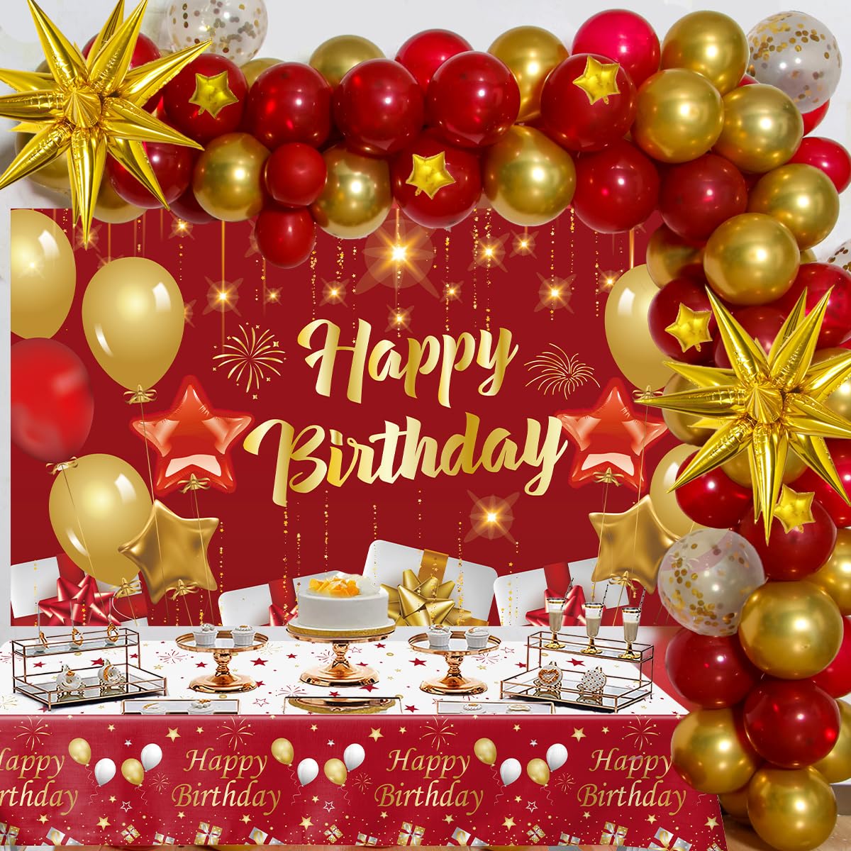 Red and Gold Birthday Decorations for Women Men Girls Boys, 72pcs Red and Gold Party Decorations Happy Birthday Backdrop Burgundy Confetti Star Balloon Arch Table Cloth Party Supplies
