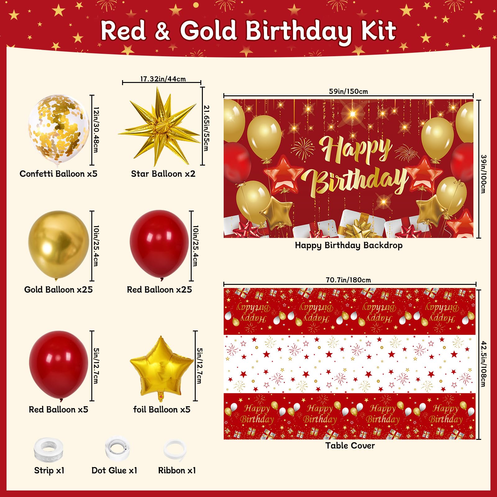 Red Gold Balloon Garland Kit --- Includes 10" pomegranate red balloons 25pcs, 10" gold balloons 25pcs, 12"confetti gold balloons 5pcs, 5" pomegranate red balloons 5pcs, gold star balloons 2pcs(55x44cm), 5" gold foil balloons 5pcs, red gold happy birthday backdrop (150x100cm), table cover (180x108cm), strip, ribbon, sticky dots.