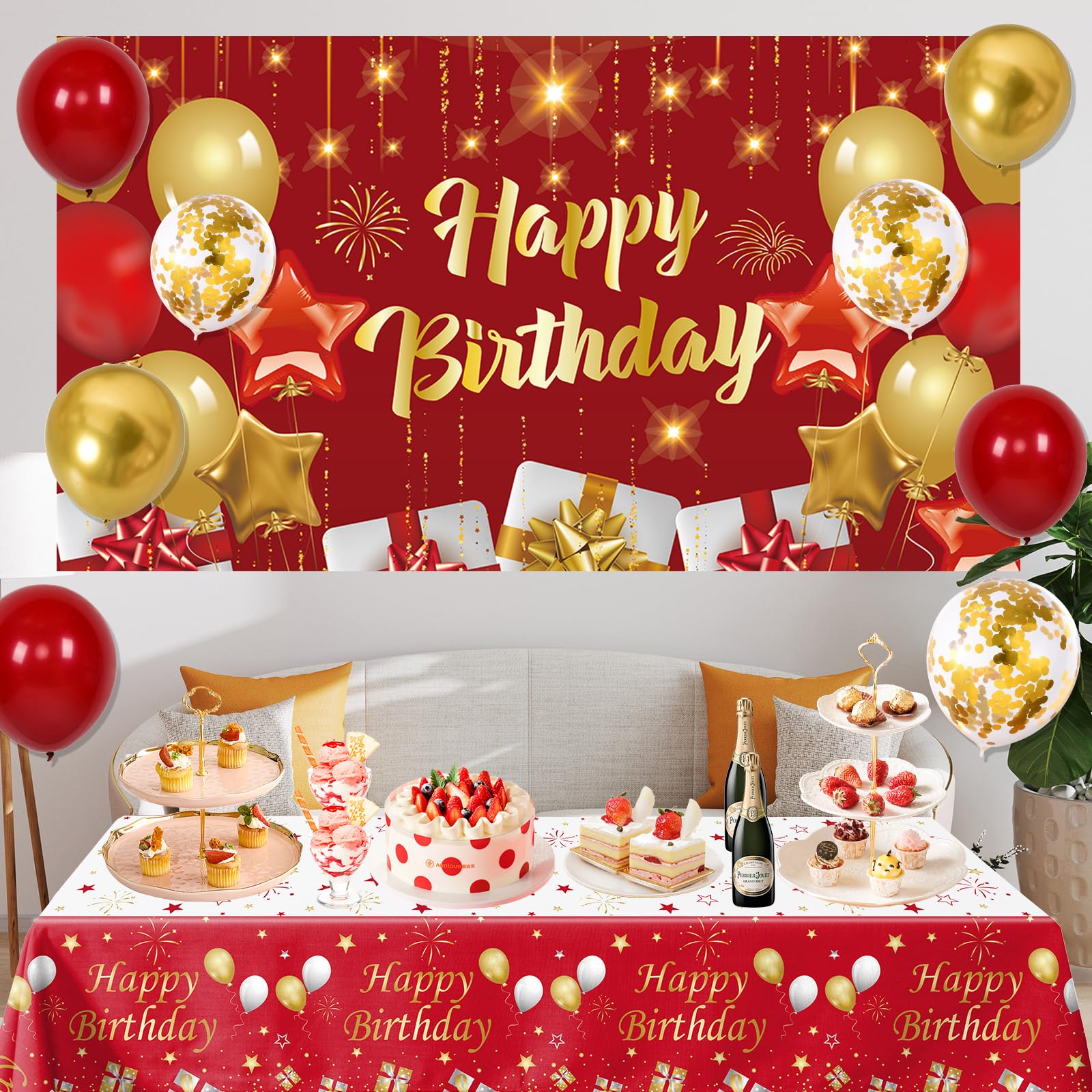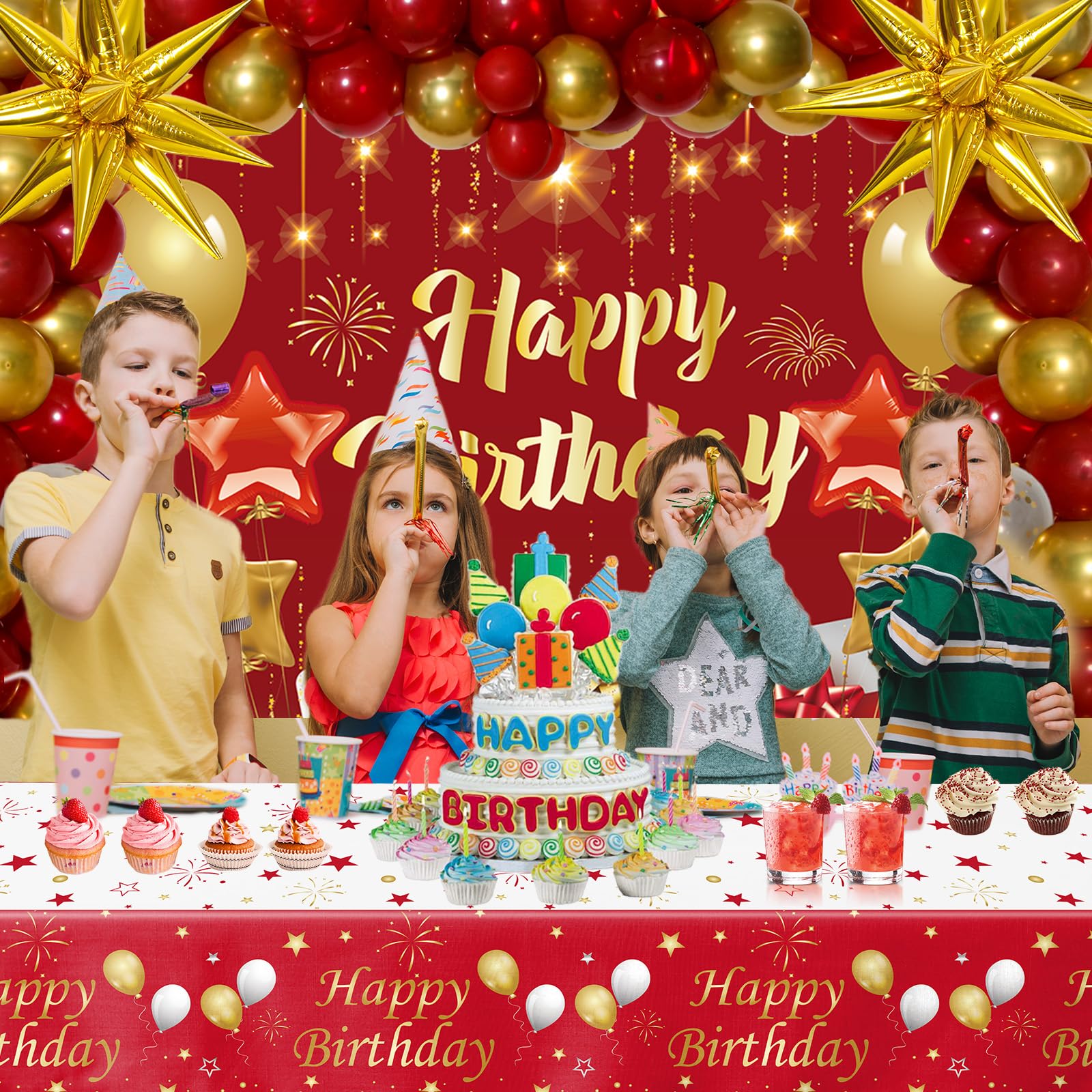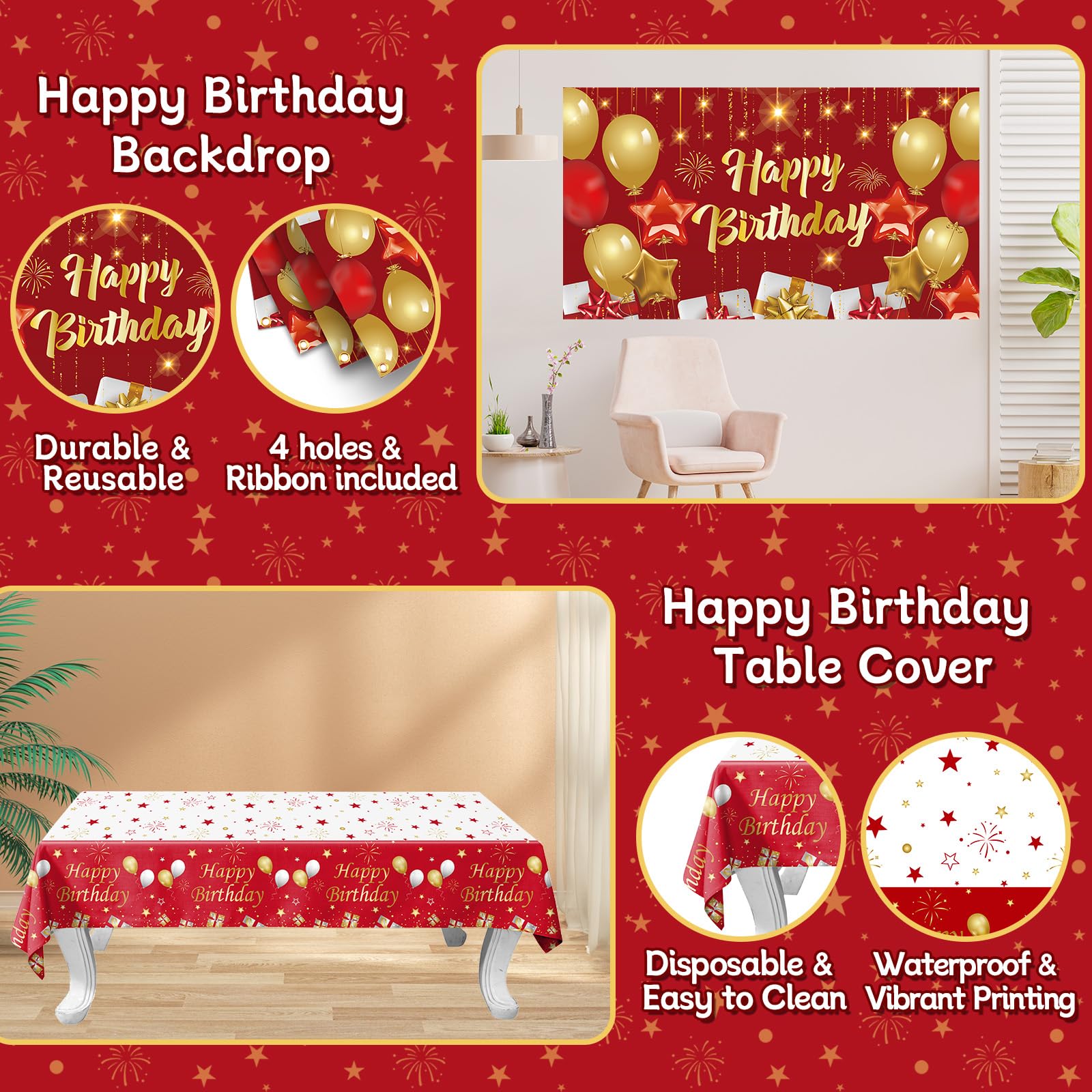 Party Photography Prop & Background: Red gold party supplies, vibrant birthday backdrop and table cover, makes the photography backdrop more vivid and charming, creates a joyful and surprising birthday party. It's ideal for party photography backdrops to leave precious photos.